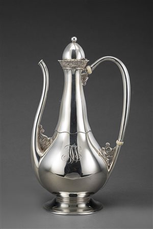 Lotto 23 Caffettiera in argento "alla turca", corpo liscio piriforme con collo sagomato, coperchio a cupola con ringhiera cesellata, manico ad ansa curva. Stati Uniti, fine sec. XIX, Tiffany & Co. (h. cm 27) (gr 700 ca) (lievi difetti) Late 20th-century "Turkish-style" silver coffee pot. Tiffany & Co. (minor defects)