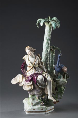 Lotto 24 Gruppo plastico policromo in porcellana raffigurante Giunone in vesti di regina con scettro e pavone su una roccia con due palme. All’interno della base marca di fabbrica in blu spade incrociate ed asterisco Meissen, fine sec. XVIII (h. cm 37,5) (difetti e restauri) Late 18th-century porcelain sculpture representing Juno (defects and restorations)
