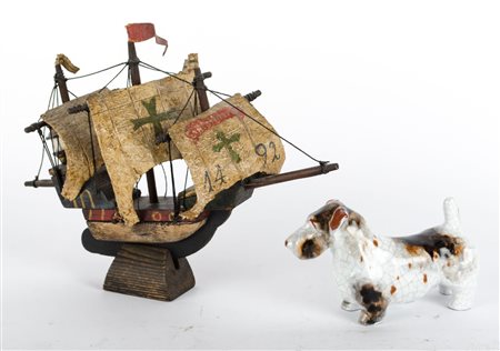 Lotto 3 LOTTO composto da MODELLINO di caravella in legno dipinto e da SCULTURA in ceramica raffigurante "cane". XX secolo Misure: varie