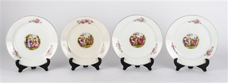 Lotto 7 QUATTRO PIATTI in ceramica Florio con medaglioni centrali raffiguranti "scene neoclassiche". Meta' '900 Misure: diametro cm 24