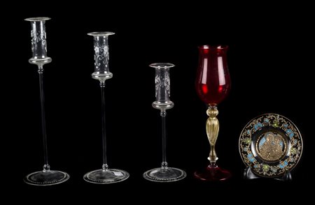 Lotto 21 LOTTO composto da tre PORTACANDELE, CALICE nei toni del rosso rubino e da PIATTINO in vetro di Murano raffigurante "Madonna con Bambino". XX secolo Misure: varie