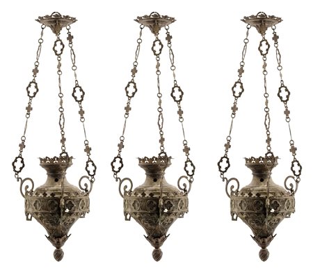 Lotto 22 TRE LAMPADE votive in metallo argentato. Italia XIX secolo Misure: h cm 60