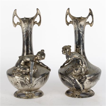 Lotto 24 COPPIA VASETTI Liberty in metallo argentato con ancelle a rilievo. Sicilia primi '900 Misure: h cm 37