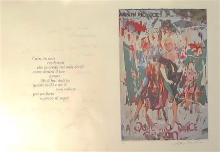 Rotella Mimmo (Catanzaro, 1918- Milano, 2006) - Merini Alda (Milano, 1931-2009) MARILYN (MARILYN, BELLEZZA ETERNA), 2005 Seridécollage su carta + poesia 50x70 cm P.A. di una tiratura a 199 esemplari + 19 P.A. "ad personam" Firmato a matita in basso a destra, a sinistra, P.A. L'opera proviene dal libro d'arte : Marilyn Bellezza eterna", di Mimmo Rotella e Alda Merini, 2005 Silkscreen and décollage multiple on paper + poetry 50x70 cm P.A. from the edition of 199 + P.A. "ad personam" Signed in pencil, lower right; P.A., lower left seridecollage su carta, 50x70 cm, firma e tiratura a matita in basso Dècollages di Mimmo Rotella proveniente dal libro: “MARILYN Bellezza eterna”, di Mimmo Rotella e Alda Merini. Questo celebre Dècollages è abbinato ad una Poesia inedita di Alda Merini, proprio come tutti gli altri Dècollages presenti nel libro; tiratura: 199 esemplari, tutti firmati e numerati.