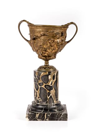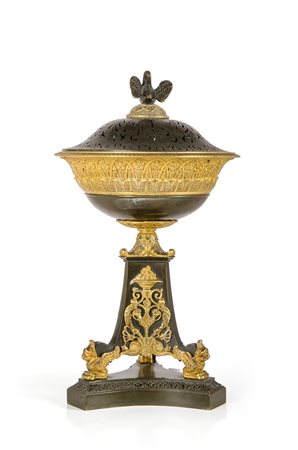 In bronzo brunito e dorato. Corpo di forma geometrica poggiante su tre piedi leonini in bronzo dorato; parte superiore a coppa con decori vegetali e presa a forma di cigno
