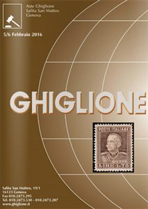 venerdì 5 febbraio 2016 ore 16:30 (UTC +01:00) 3 Sessioni 5/02/2016 ore 16:30 Prima Sessione - dal lotto 1 al lotto 3042 (1 - 3042) 6/02/2016 ore 10:30 Seconda Sessione - dal lotto 3043 al lotto 5955 (3043 - 5955) 6/02/2016 ore 14:30 Terza Sessione - dal lotto 5956 al lotto 6576 (5956 - 6576) Asta N. 93 - Filatelia Ghiglione 1885