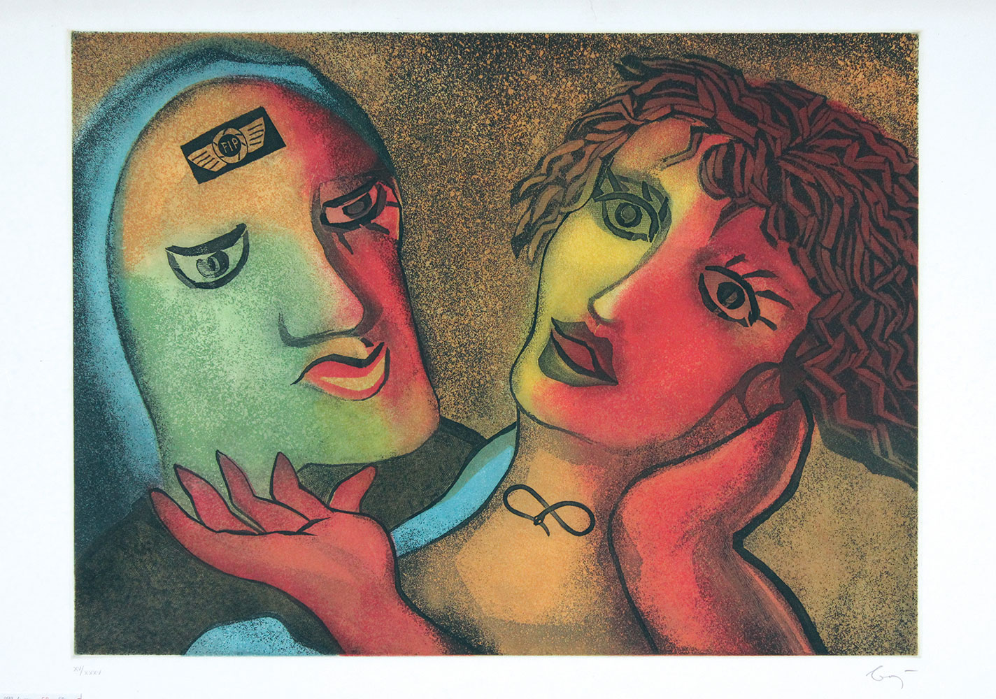 Baj Enrico Amanti acquaforte acquatinta su carta, cm. 70x100, es. XV/XXXV firmata in basso a destra, timbro a secco della Stamperia Grafica d'Arte Lombardi di Roma in basso a sinistra, certificato di garanzia della Grafica d'Arte Lombardi di Roma timbrato e firmato ed etichetta Valente Arte Contemporanea al retro