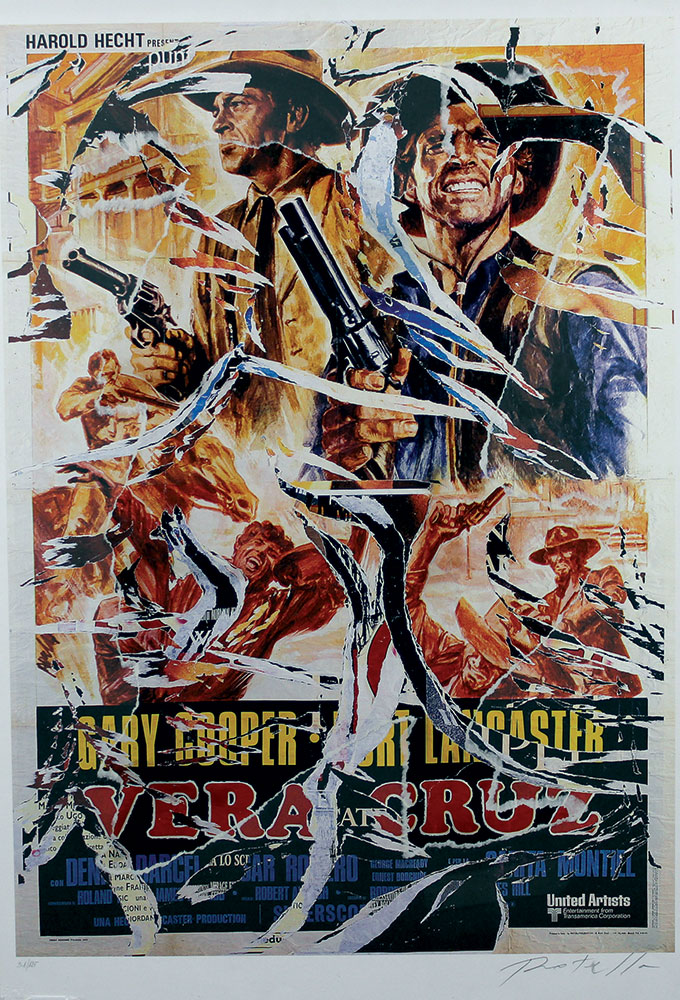 Rotella Mimmo Vera Cruz litografia su carta, cm. 100x70, es. 31/125 firmata in basso a destra, timbro a secco Fondazione Rotella di Milano in basso a sinistra, pubblicato sul catalogo "Mimmo Rotella Multiples Decollages" Silvana Editoriale, pp. 86-87, certificato di garanzia e lecita provenienza FB Arte