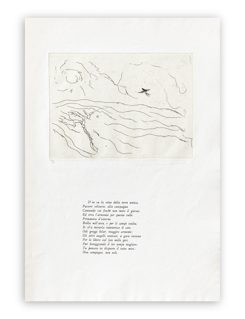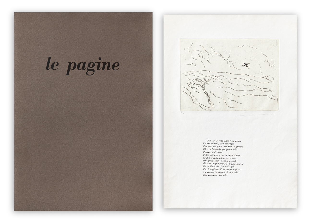 Folder contenete un'acquaforte di Ernesto Treccani con poesia "Il passero solitario" di Giacomo Leopardi