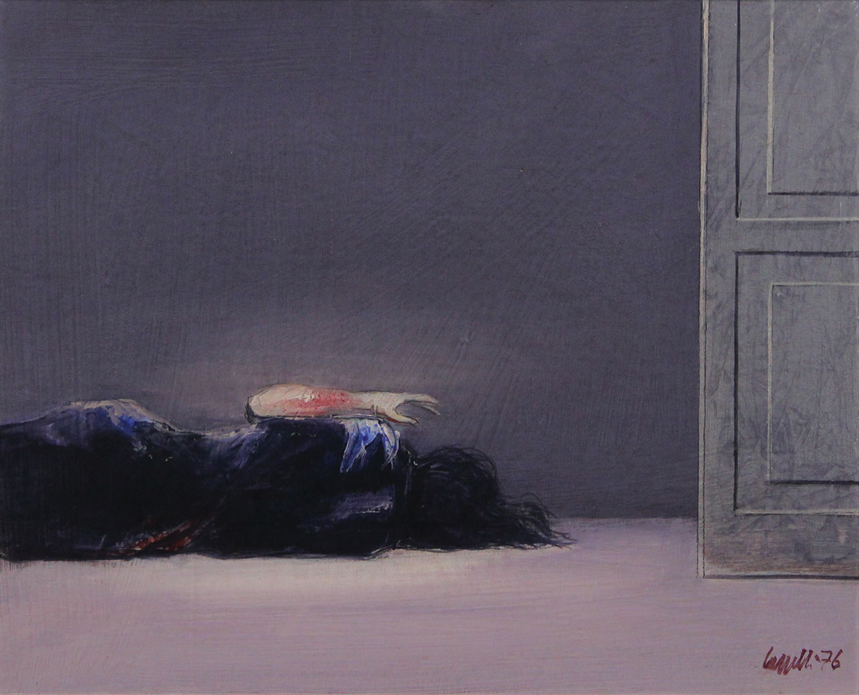 Cappelli Giovanni Figura agonizzante, 1976 olio su cartone, cm. 40x50,6 firmato e datato in basso a destra, firmato al retro sul passepartout