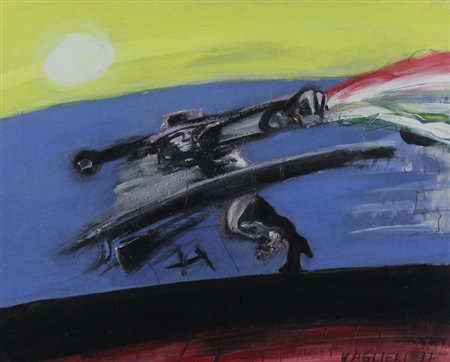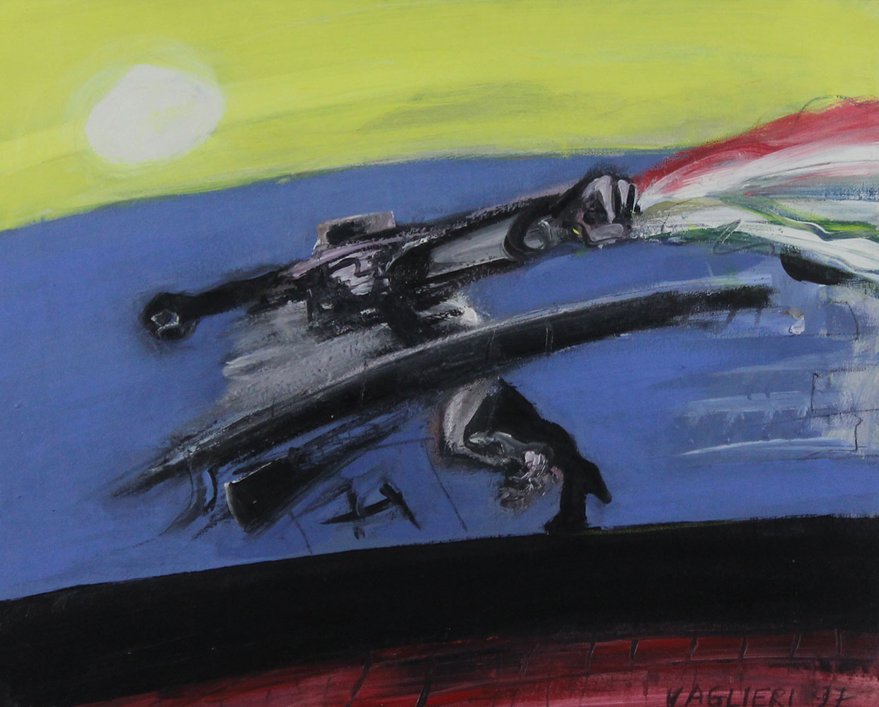Vaglieri Tino Figura che corre (Che Guevara) (come nazionalista sudamericano), 1997 olio su tela, cm. 40x50 firmato e datato in basso a destra, firmato, intitolato e datato al retro