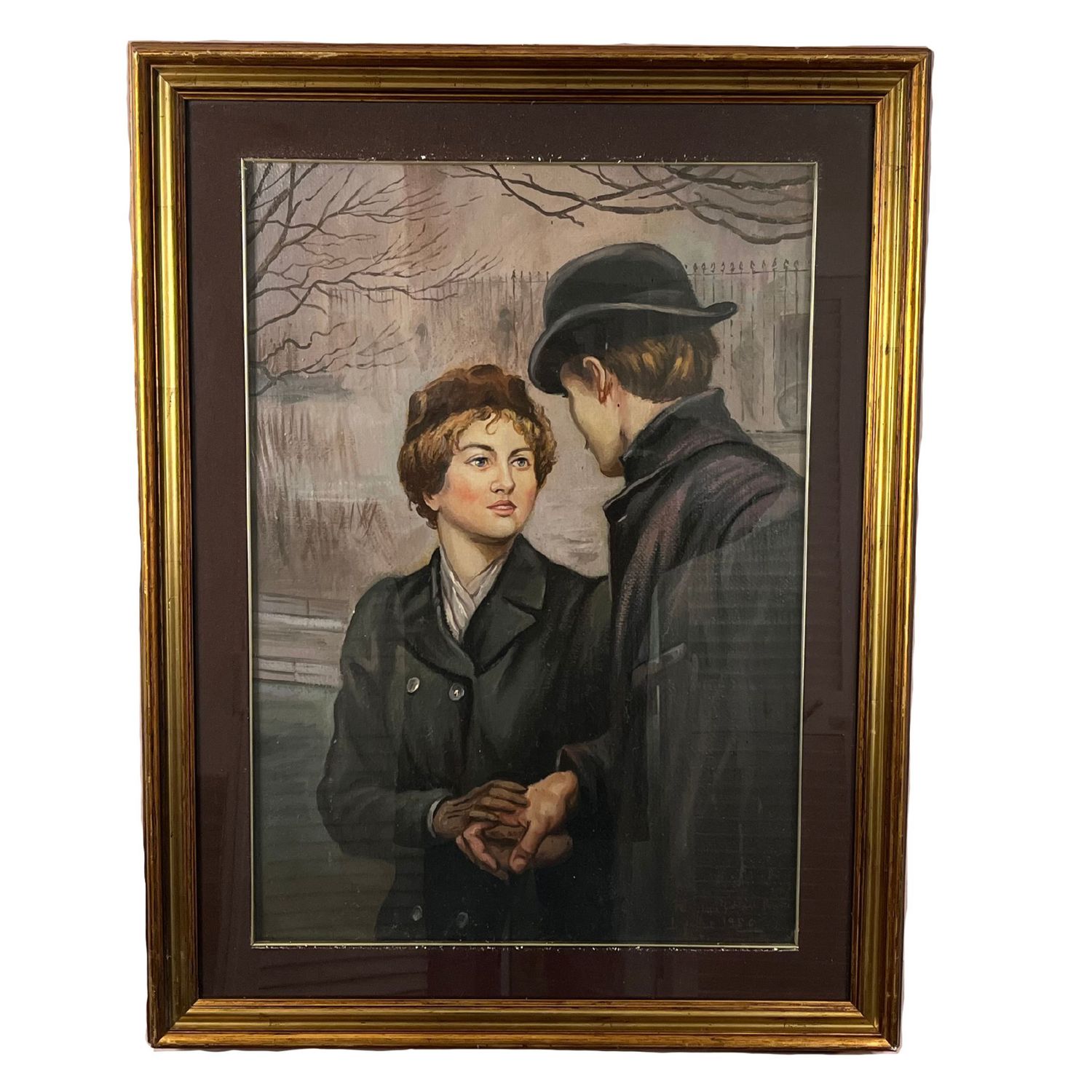 Dipinto olio su tela, periodo XX secolo raffigurante Giovane coppia nella maniera di Hugh Goldwin Rivière, artista britannico.