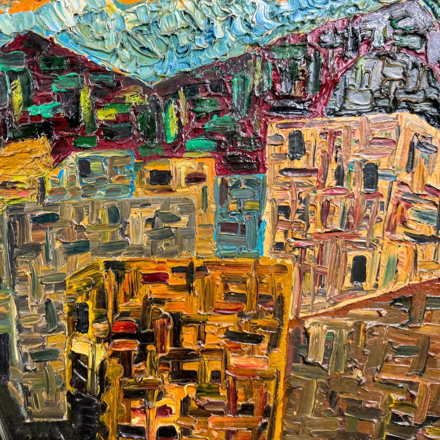 Dipinto tecnica grassa su tela, periodo XX secolo, scuola Italiana raffigurante Strada con edifici (luogo imprecisato)