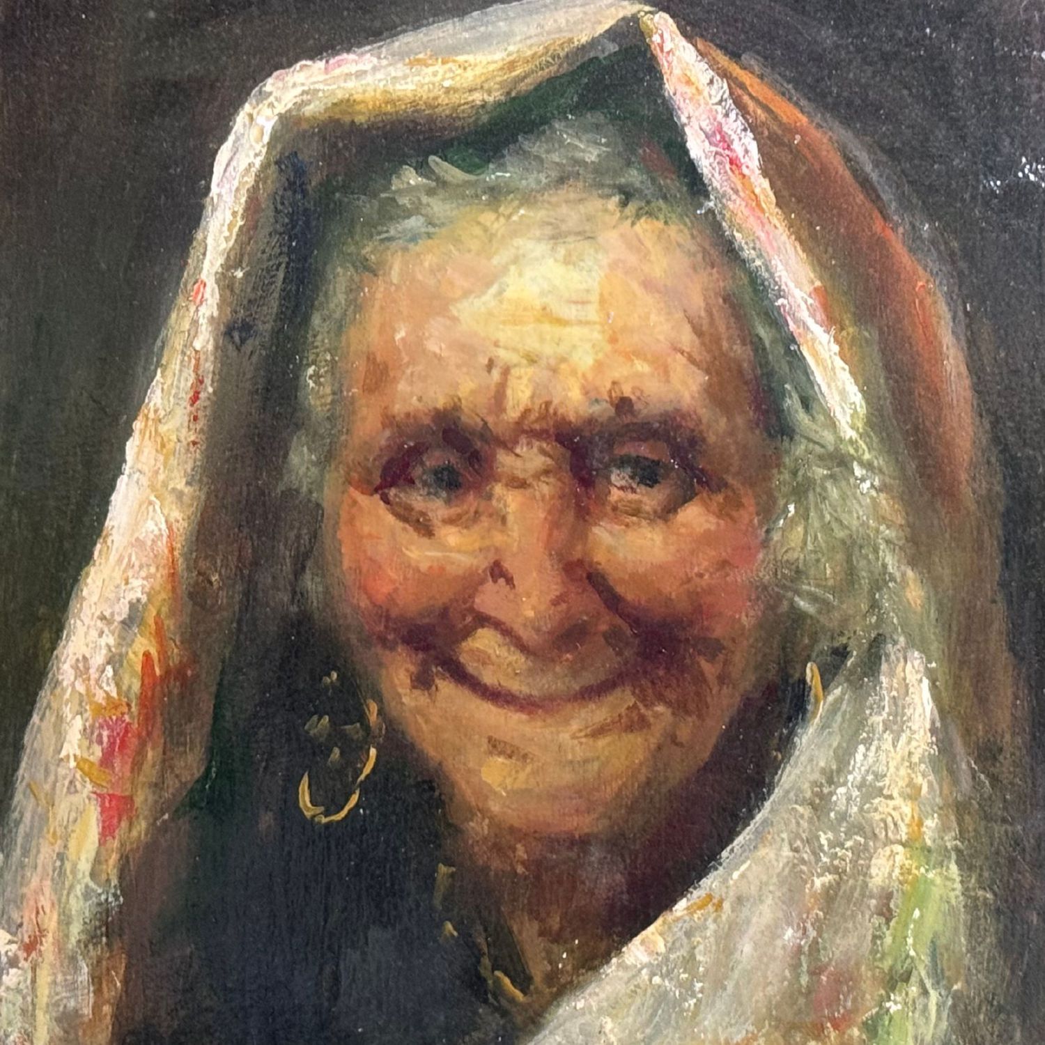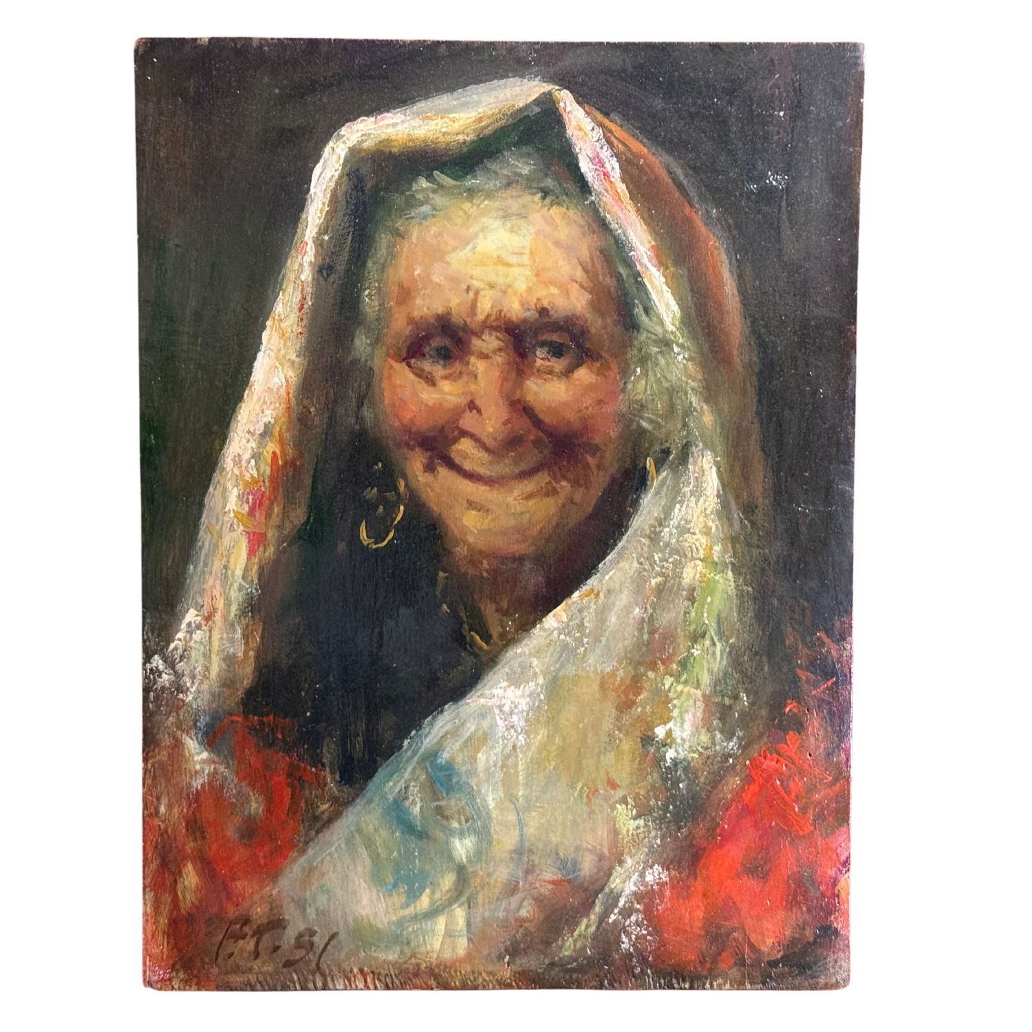 Piccolo dipinto olio su pannello, periodo XX secolo scuola Italiana, raffigurante Ritratto di donna anziana.