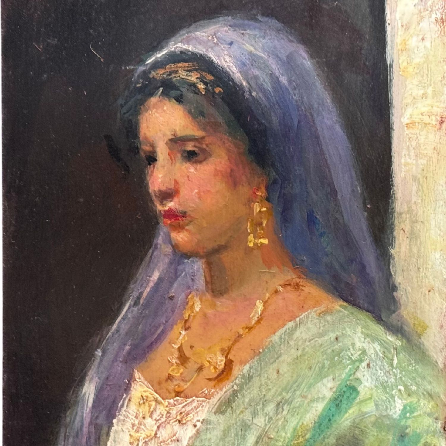 Piccolo dipinto olio su pannello, periodo XX secolo scuola Italiana, raffigurante Donna con turbante.