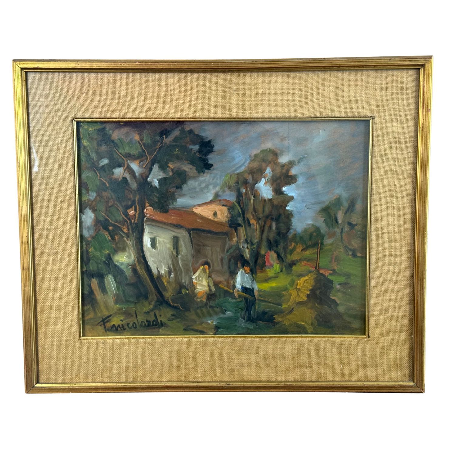 Dipinto olio su pannello, periodo XX secolo scuola Italiana, raffigurante Contadini in campagna.