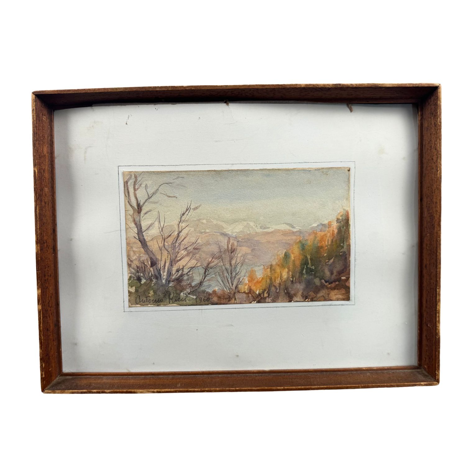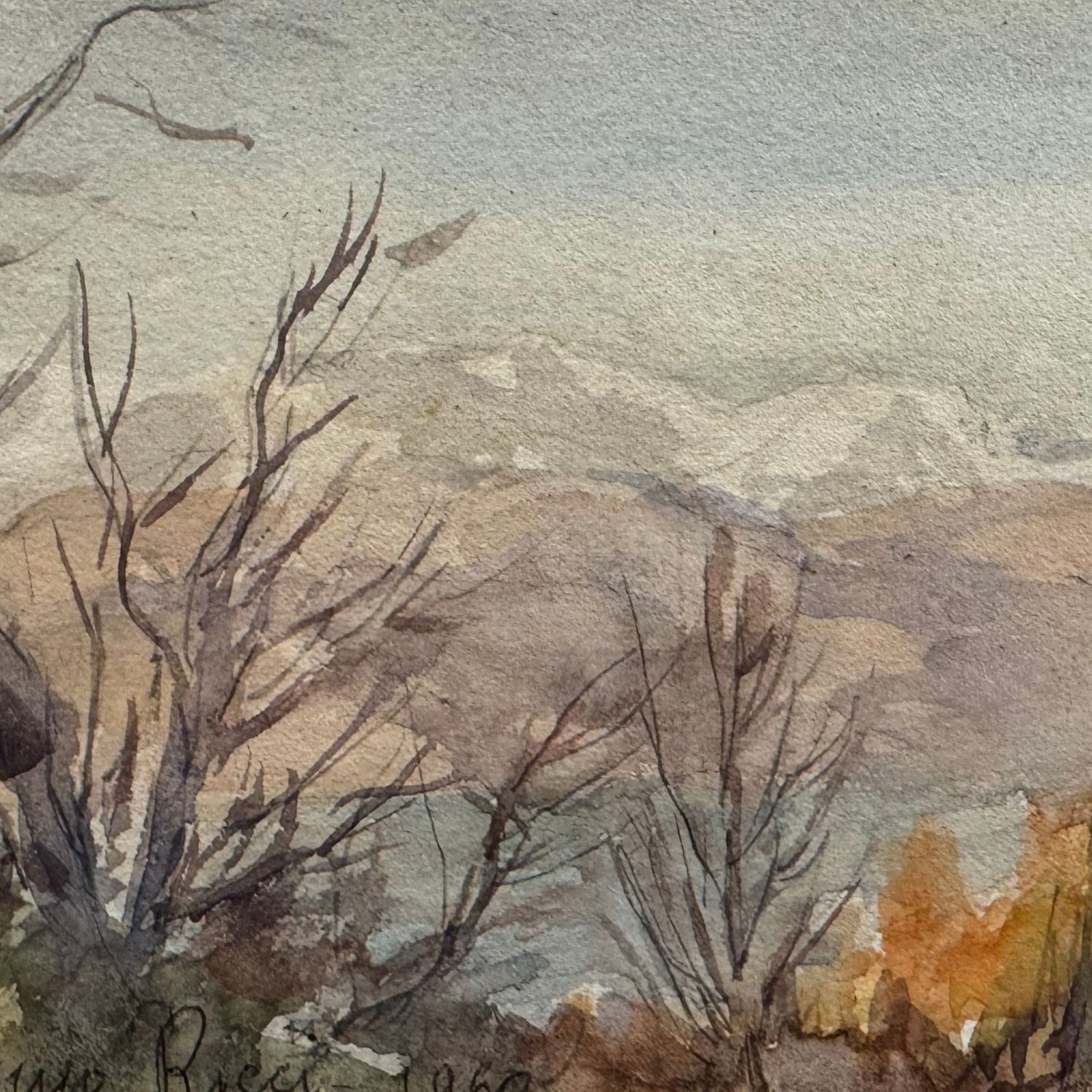Dipinto ad acquerello, periodo 1960 scuola Italiana, raffigurante Montagne.