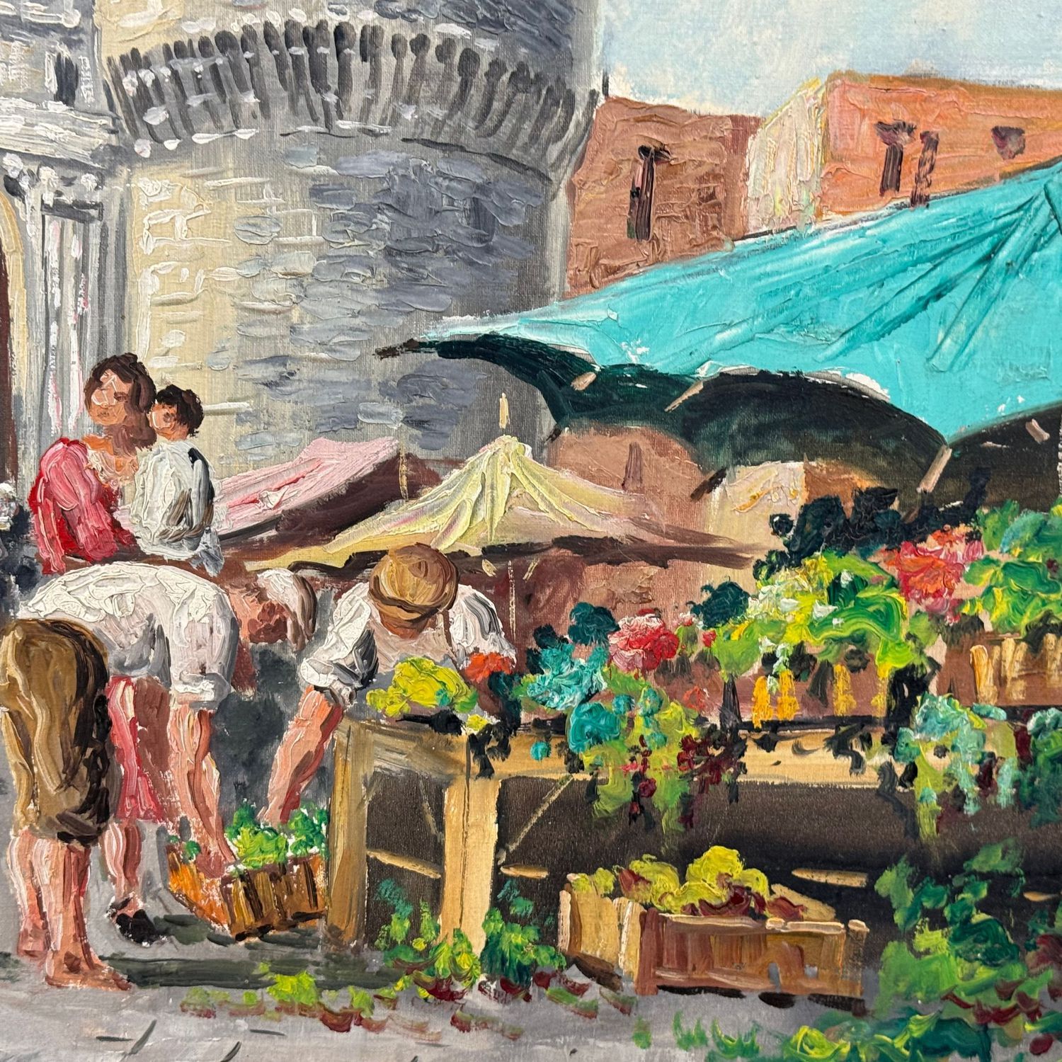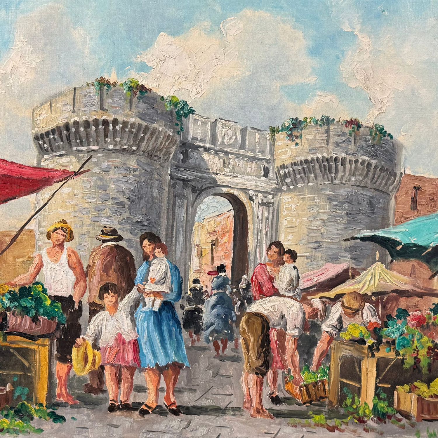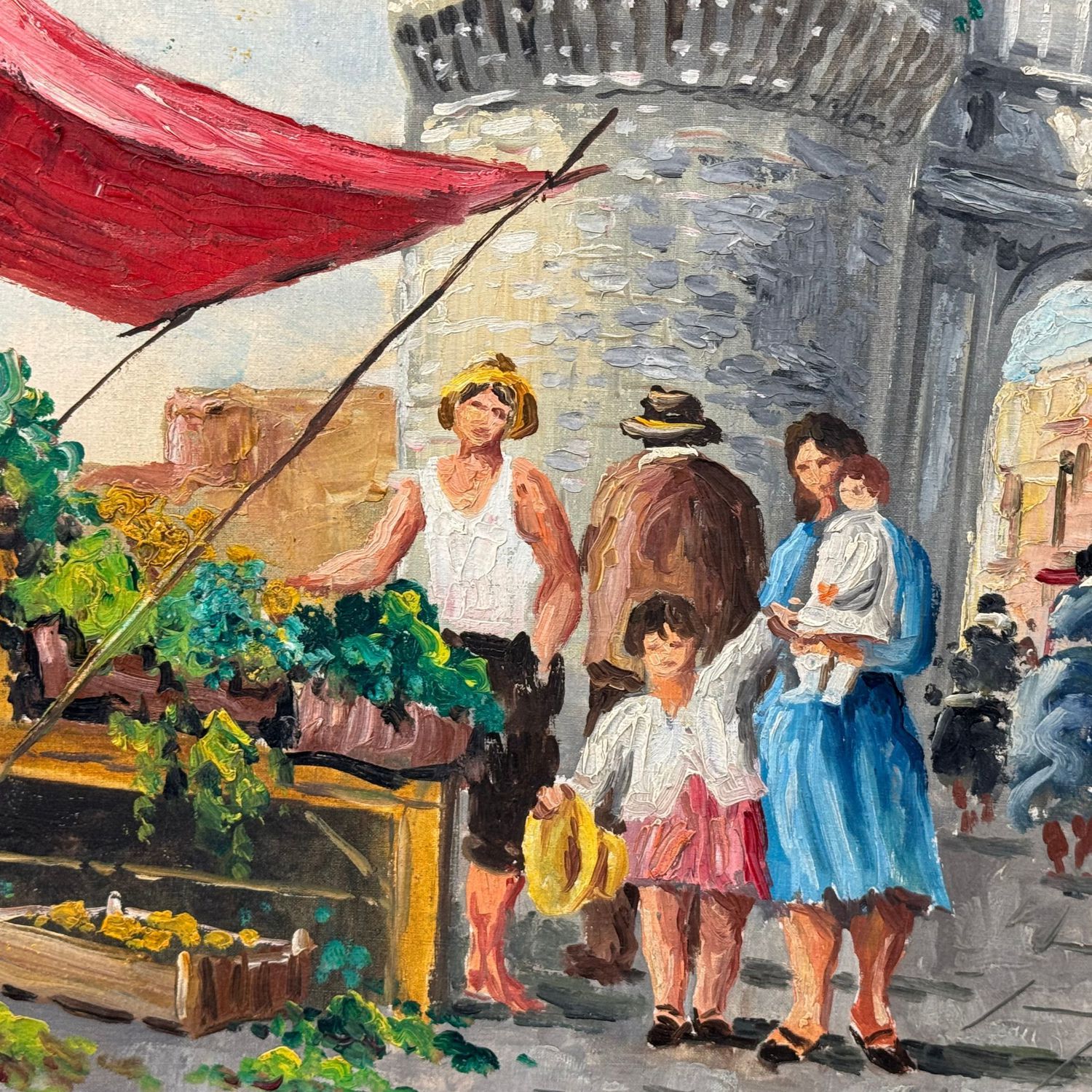 Dipinto olio su tela, periodo XX secolo scuola Italiana, raffigurante Scena di mercatino a Porta Capuana (Napoli)