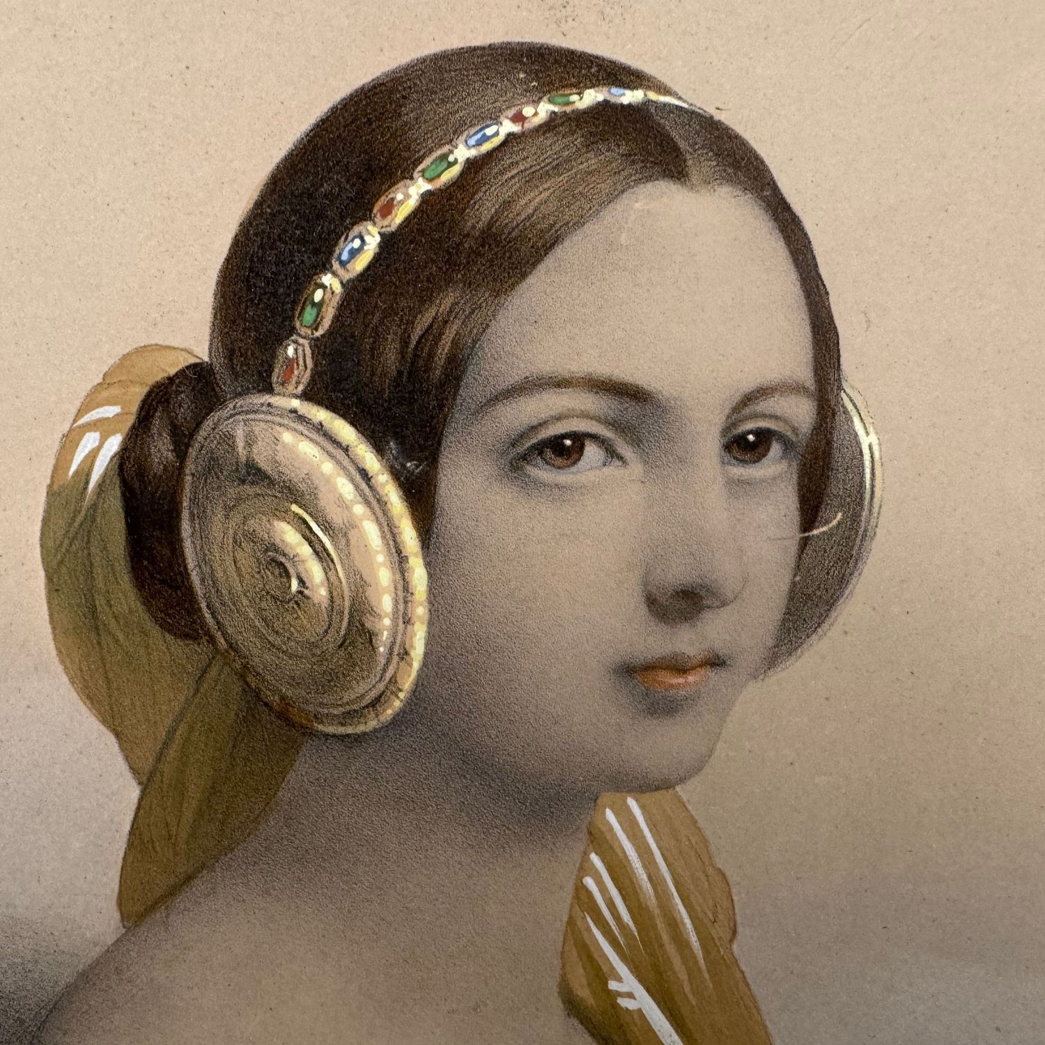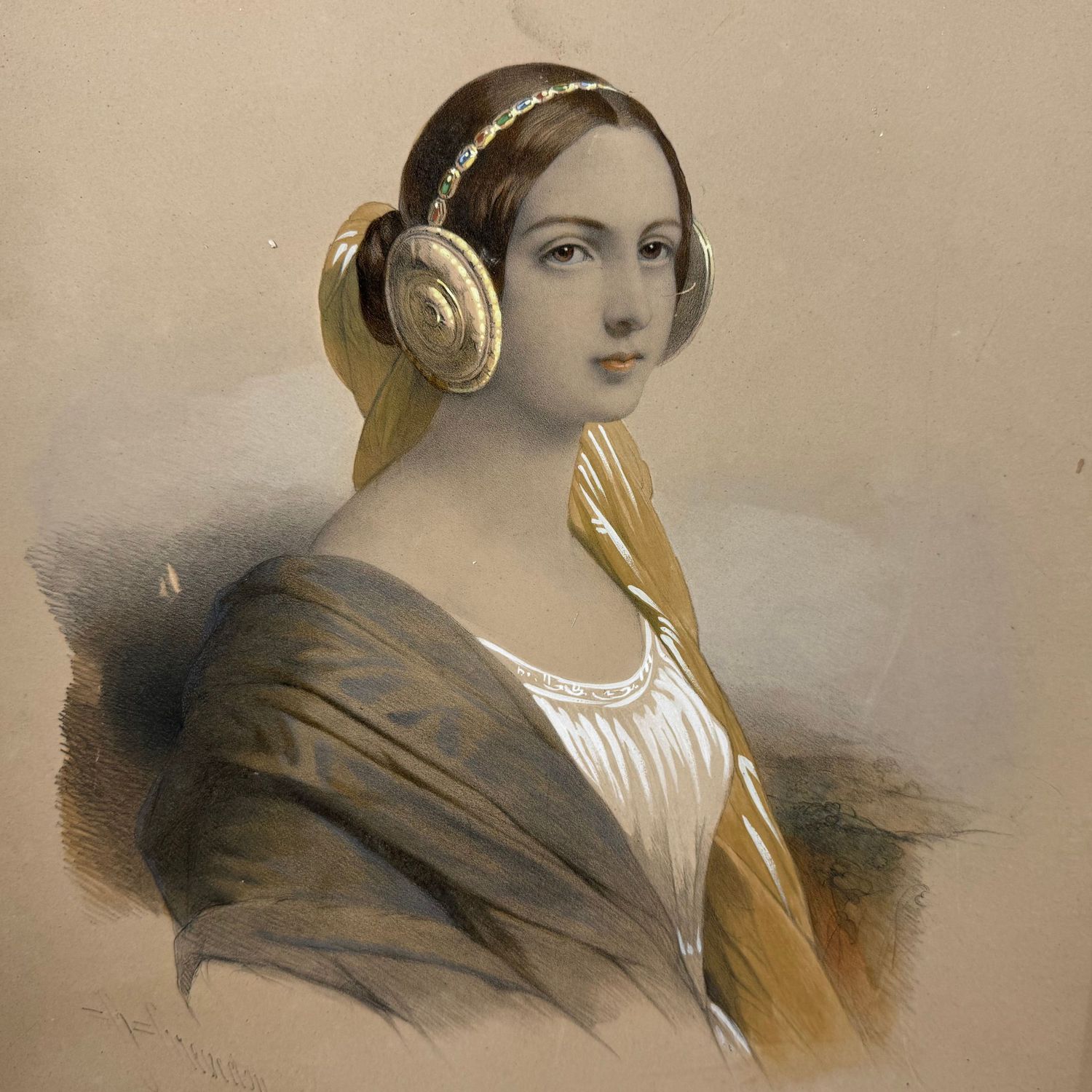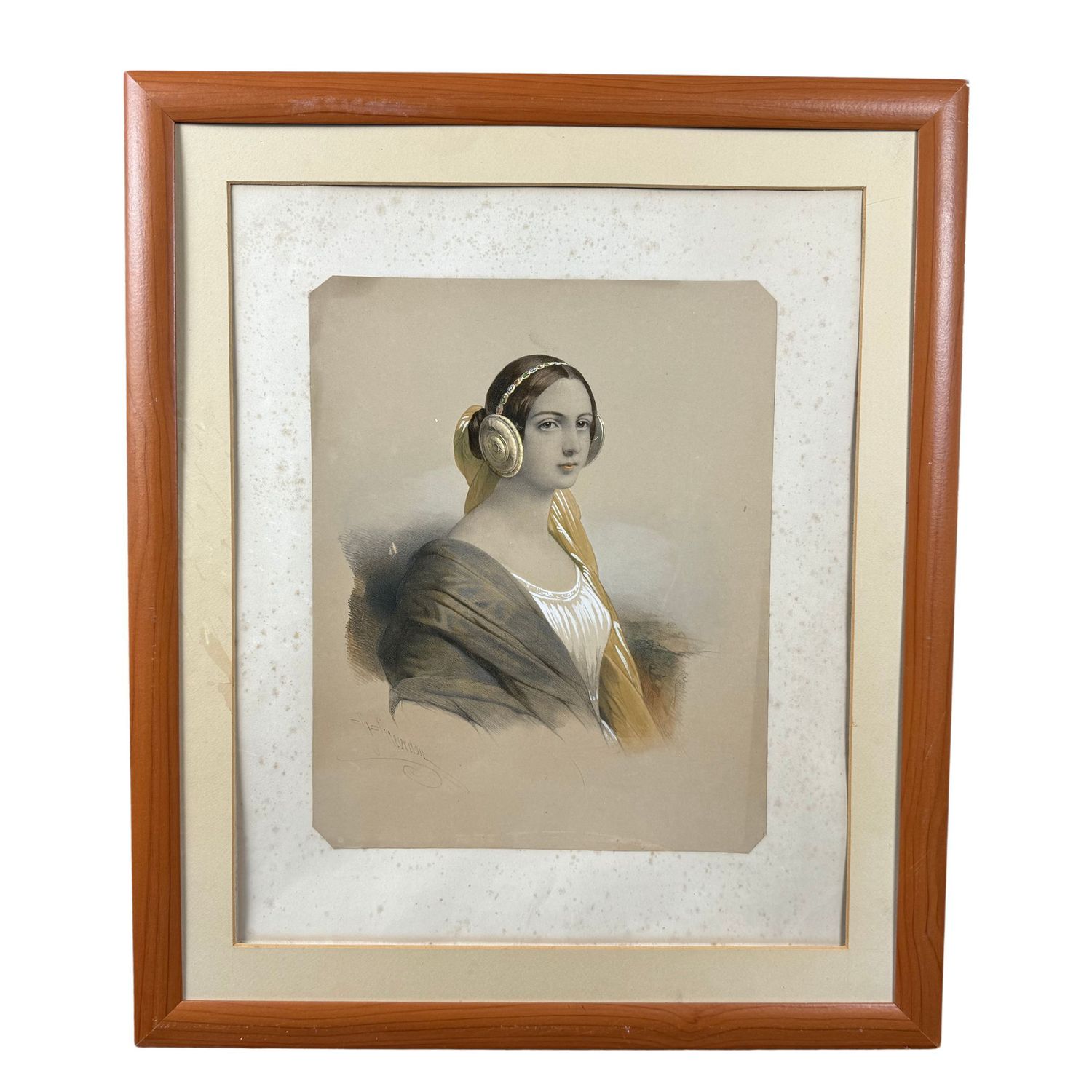 Stampa acquerellata, periodo XIX/XX secolo scuola Italiana, raffigurante Ritratto di donna.