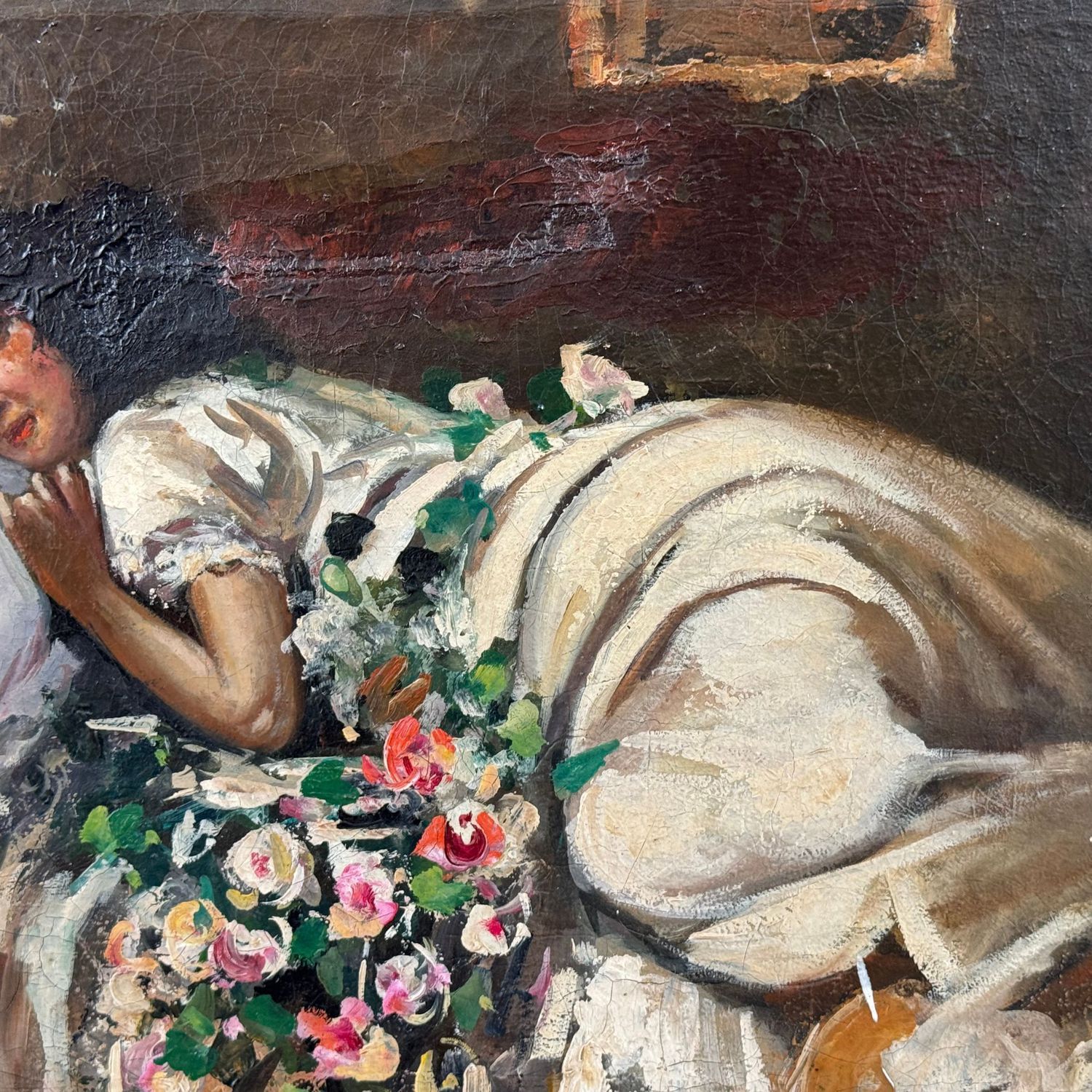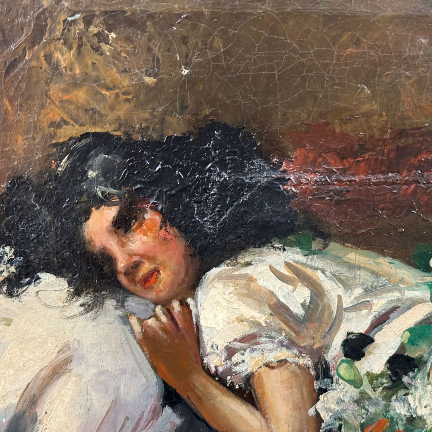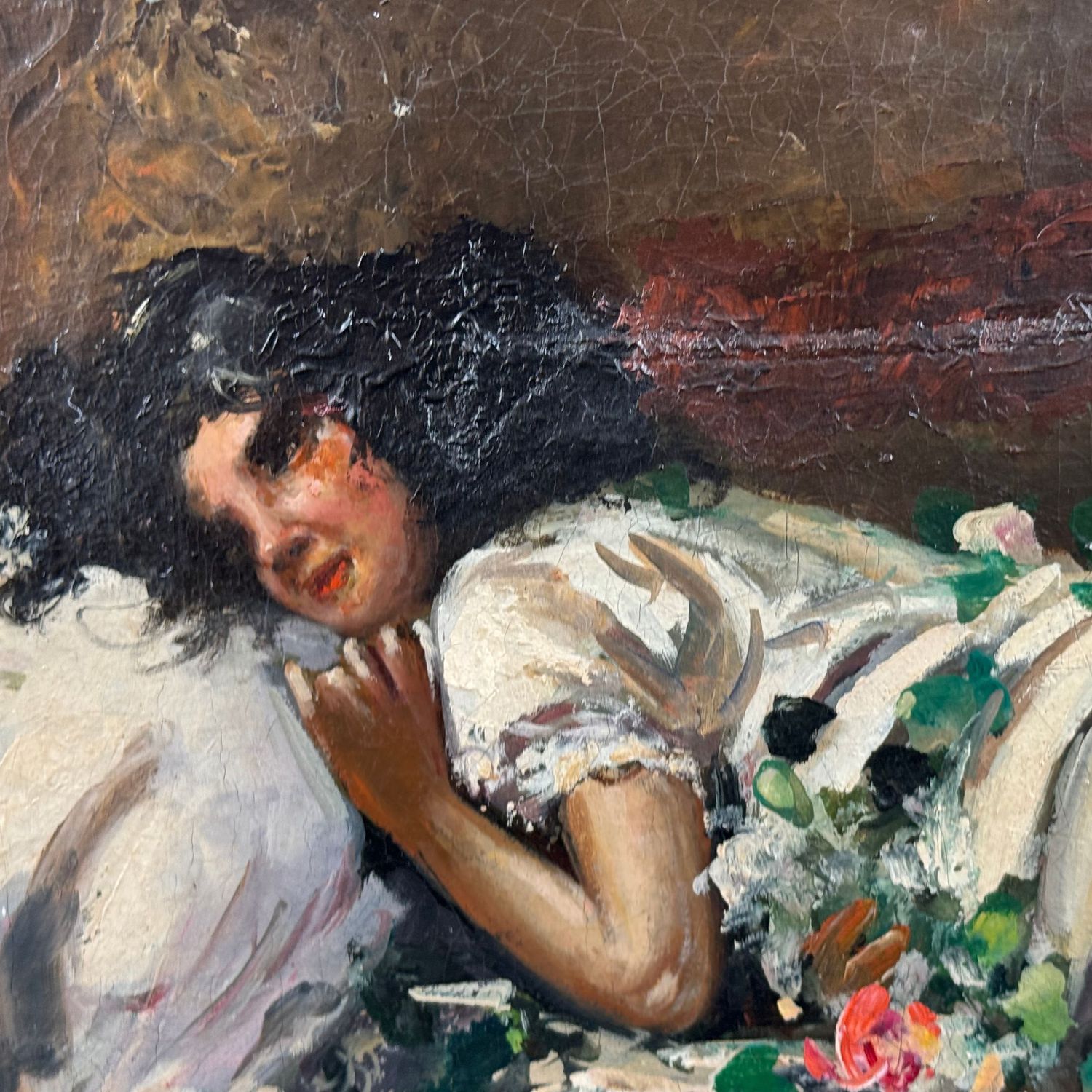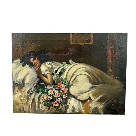 Dipinto olio su tela, periodo XIX/XX secolo scuola Italiana, raffigurante Donna su sofà.