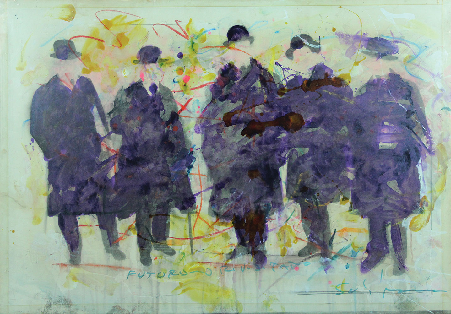Schifano Mario Futurismo rivisitato, 1970 smalto e pastelli su carta intelata-perspex, cm. 70x100 firmato in basso a destra, intitolato in basso al centro, al retropresente scritta "Parigi 1912: Russolo, Carrà, Marinetti, Boccioni e Severini", opera inserita nell'archivio dell'opera di Mario Schifano presso la Fondazione M.S. Multistudio in data 2012