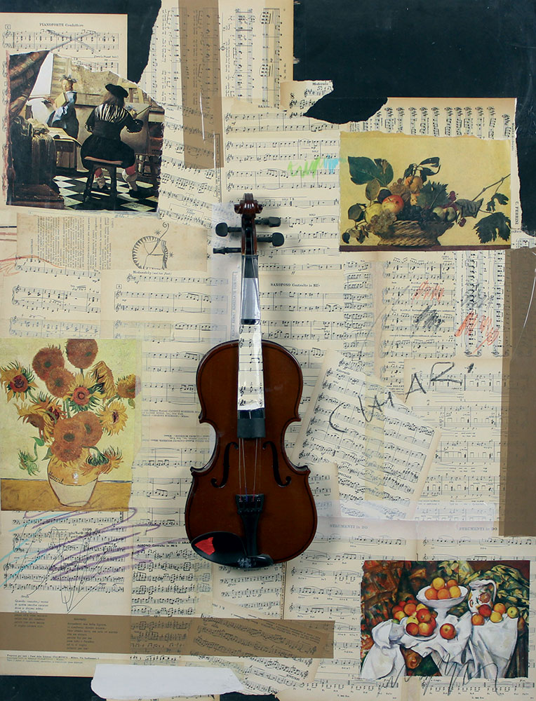 Chiari Giuseppe Violino tecnica mista su tavola entro teca di plexiglass, cm. 91,5x71x11,5 firmata a destra, certificato di autenticità dell'artista su fotografia