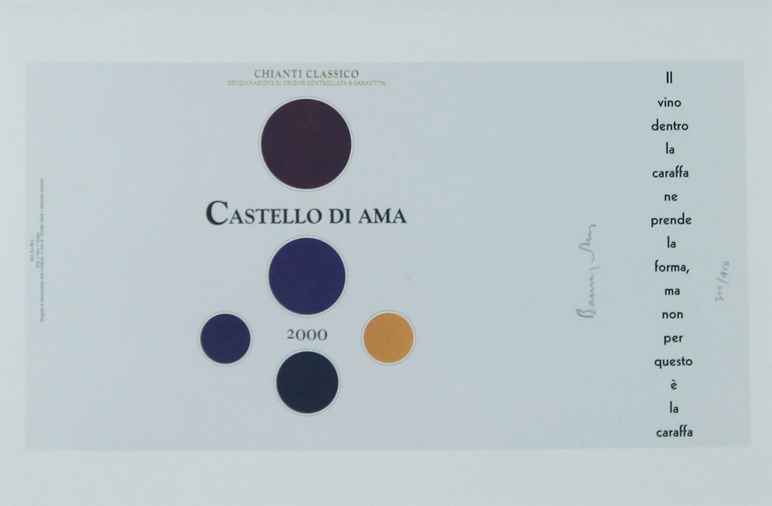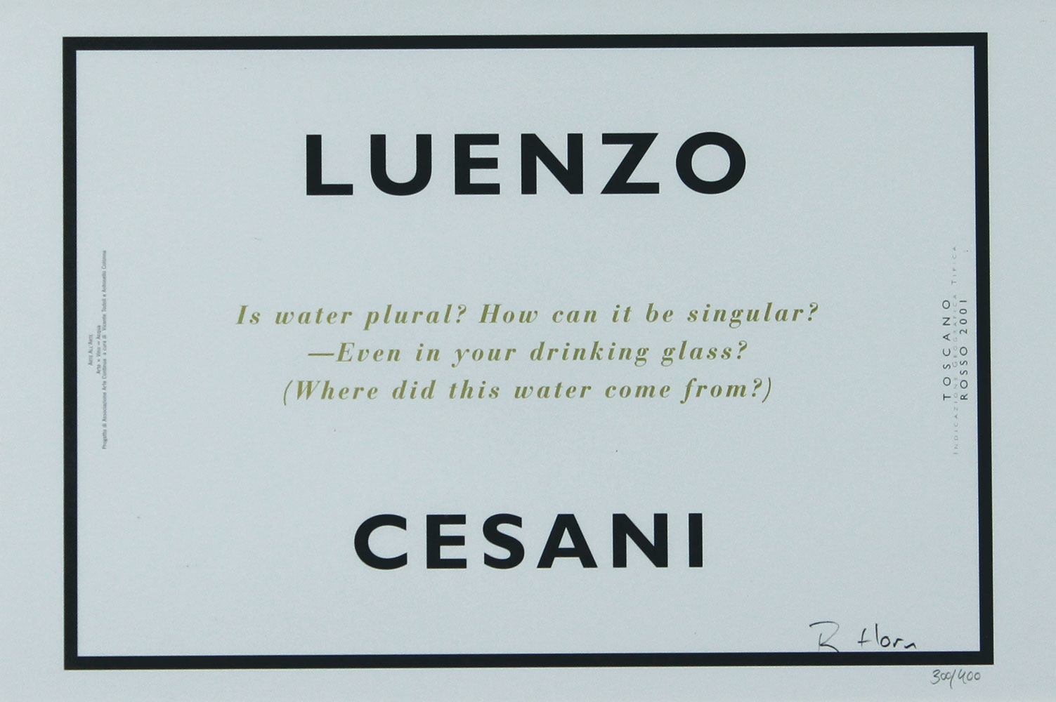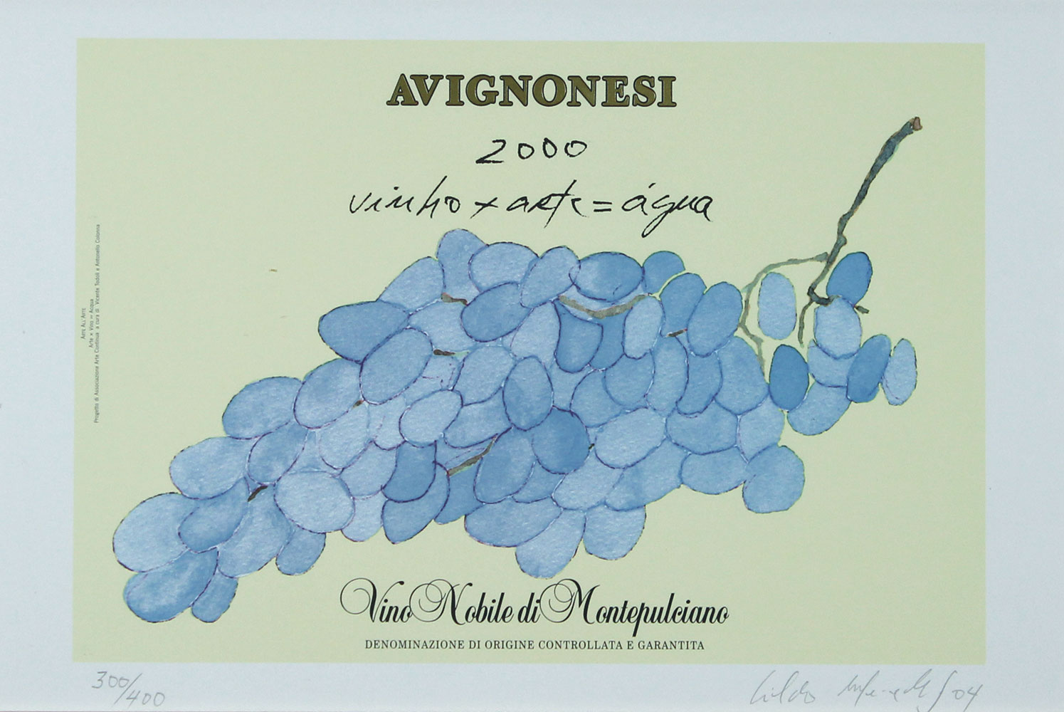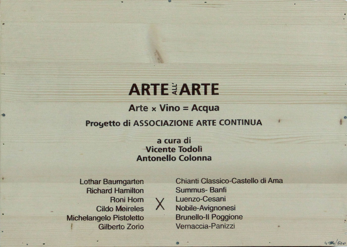AA.VV. Arte x Vino = Acqua sei litografie su carta e cassetta di legno contenente sei bottiglie di vino cassetta di cm. 36,5x51x10 es. 494/500 contenente sei bottiglie di Chianti Classico Castello di Ama, Summus Banfi, Luenzo Cesani, Nobile di Montepulciano Avignonesi, Brunello di Montalcino il Poggione, Vernaccia Riserva Panizzi + sei litografie su carta tutte firmate di Lothar Baumgarten, Richard Hamilton, Roni Horn, Cildo Meireles, Michelangelo Pistoletto, Gilberto Zorio, cm. 34x50, di cui cinque es. 300/400 e uno 246/400 provenienza Galleria Continua