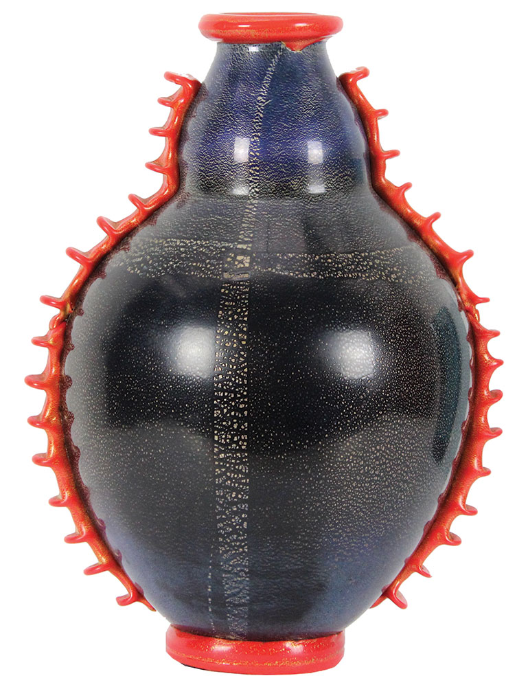 Vaso blu e nero vaso in vetro di Murano blu e nero in pasta con inclusione di foglia d'argento, piede e bocca in filamento in pasta vitrea rossa con inclusione di foglia d'oro, h. cm. 36,5, diam. cm. 26