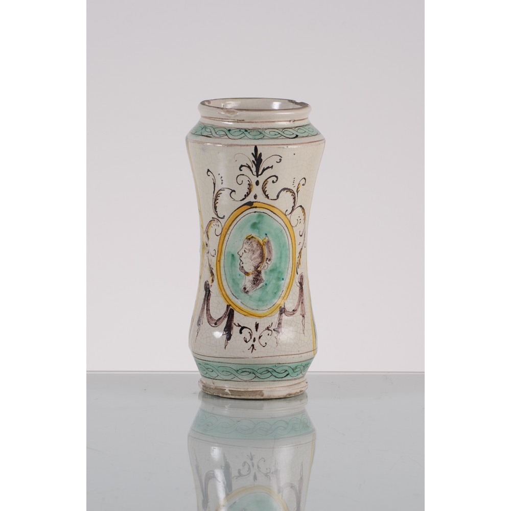 Albarello in ceramica smaltata e decorata raffigurante "Profilo di figura" (usure).
