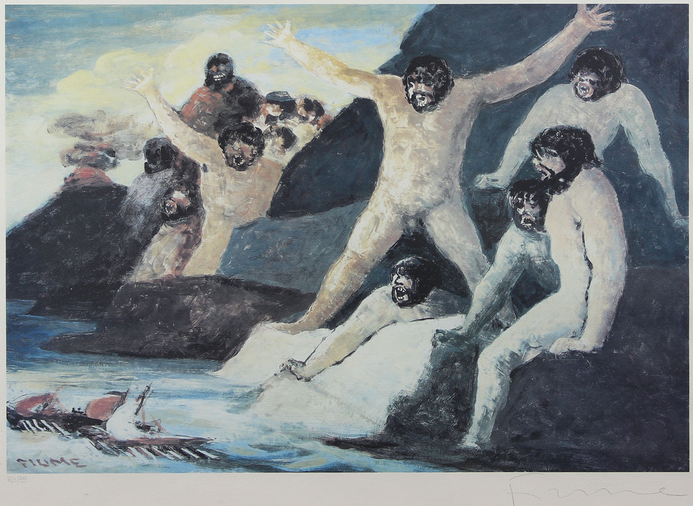 Fiume Salvatore Attacco dei Lestrigoni a Ulisse fotolitografia su carta, cm. 60x80, es. 743/999 firmata in basso a destra, firmata a sinistra in lastra