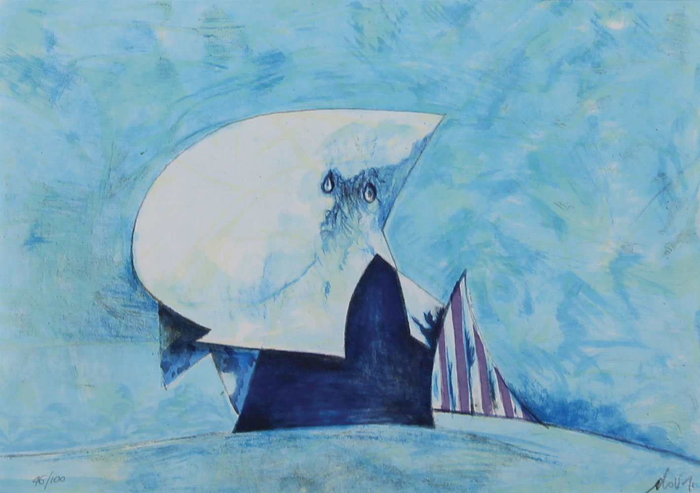 Dova Gianni Uccello litografia su carta, cm. 25x35, es. 46/100 firmata in basso a destra, timbro a secco della Casa Editrice La Nuova Foglio di Pollenza - Macerata, certificato di garanzia della Casa Editrice La Nuova Foglio di Pollenza - Macerata del 10/03/1976 al retro