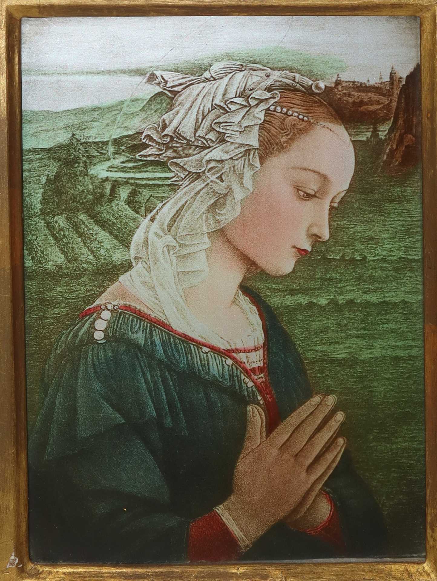 Madonna delle rocce, 20° secolo 25 x 18m cm in cornice h 43 x 38 cm Smalto su metallo zincato Copia da Filippo Lippi