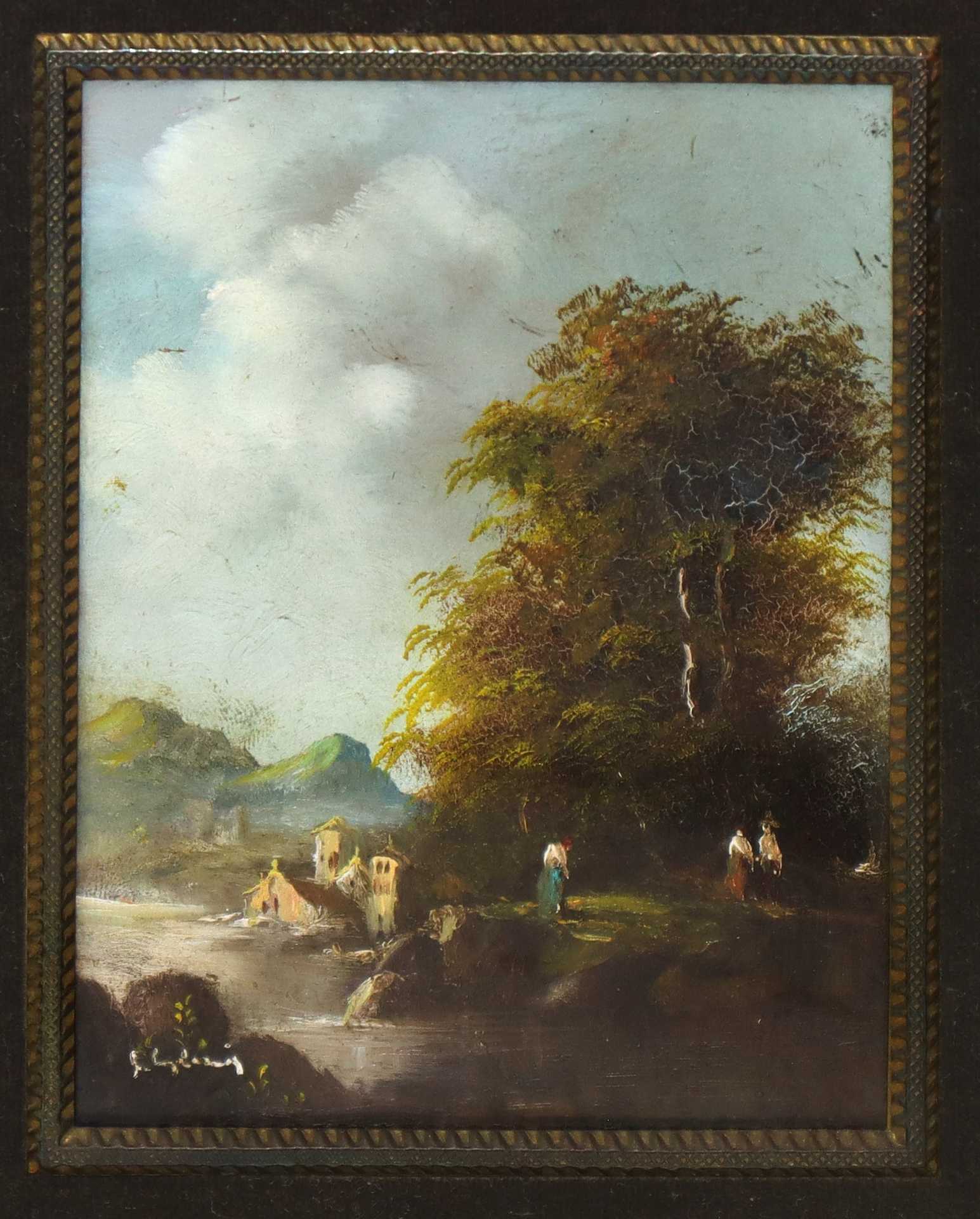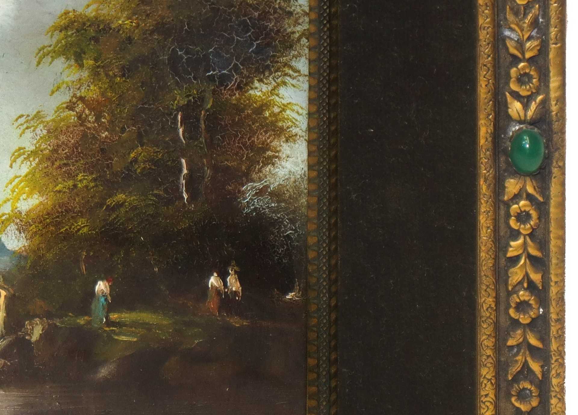 Paesaggio con personaggi, 20° secolo Cm 12x9, in cornice cm 20x18 Dipinto ad olio su su rame In cornice di metallo dorato con pietre dure colore verde