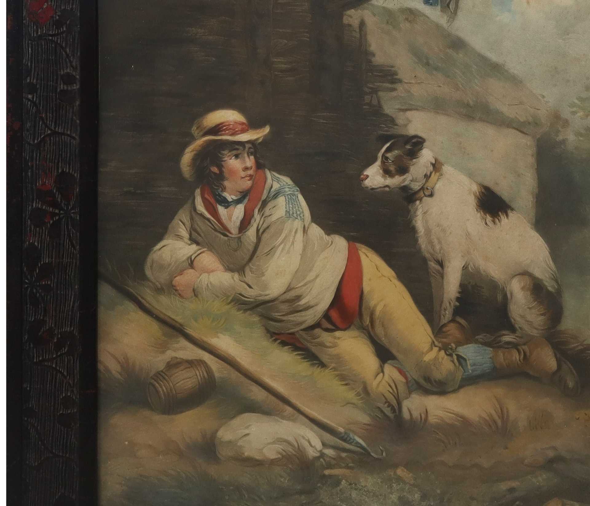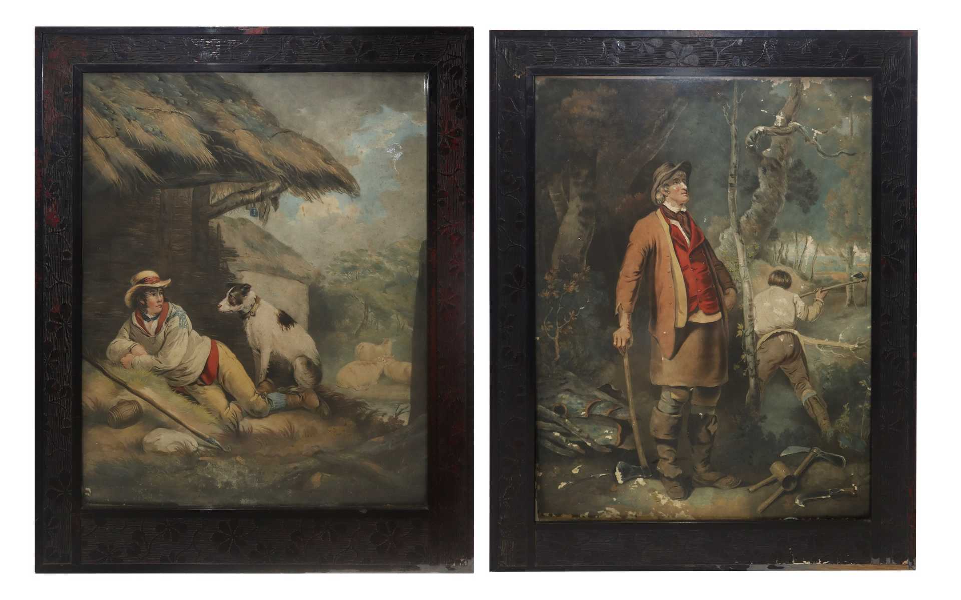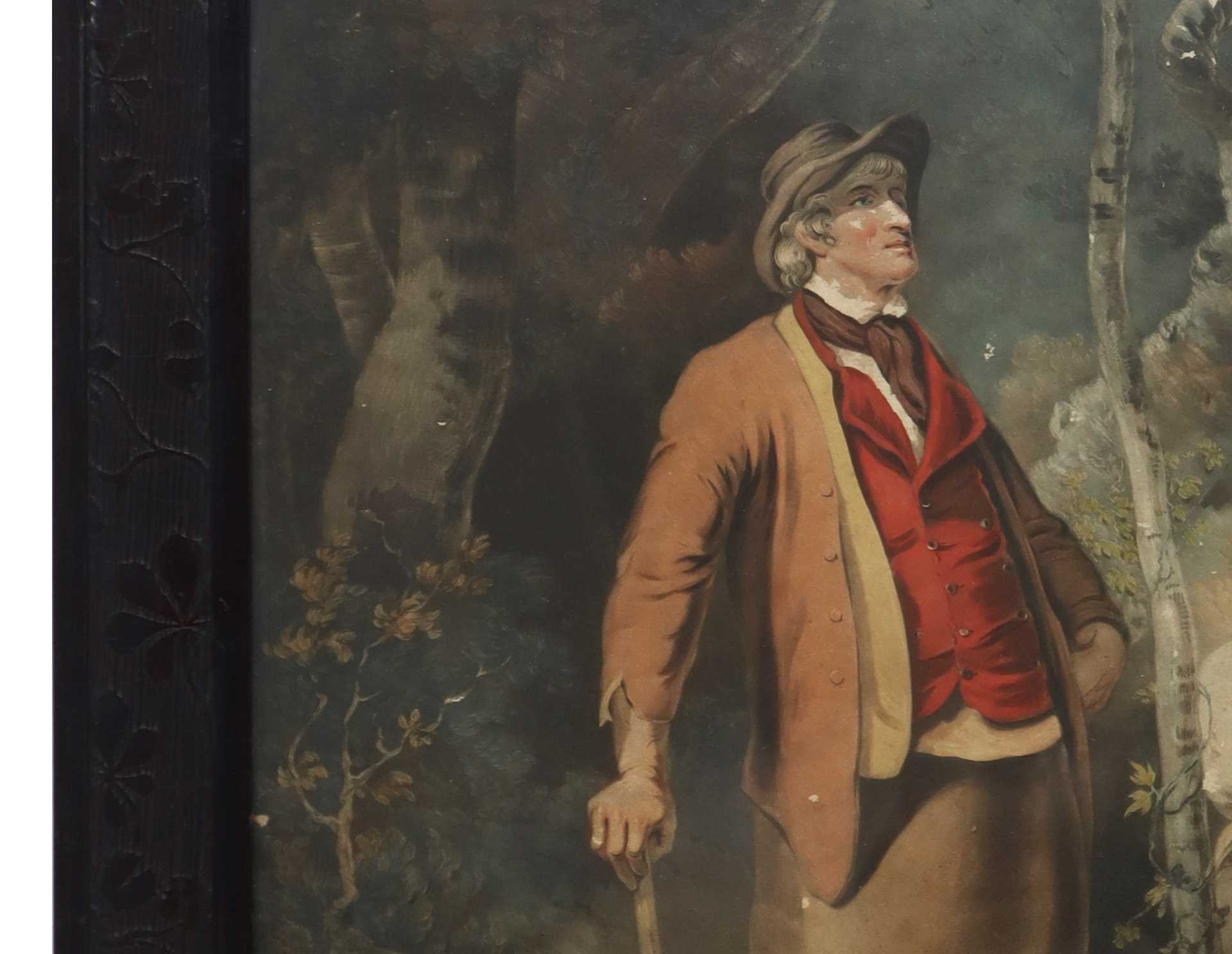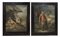 Coppia di stampe con personaggi in cornice di legno con decorazioni floreali