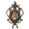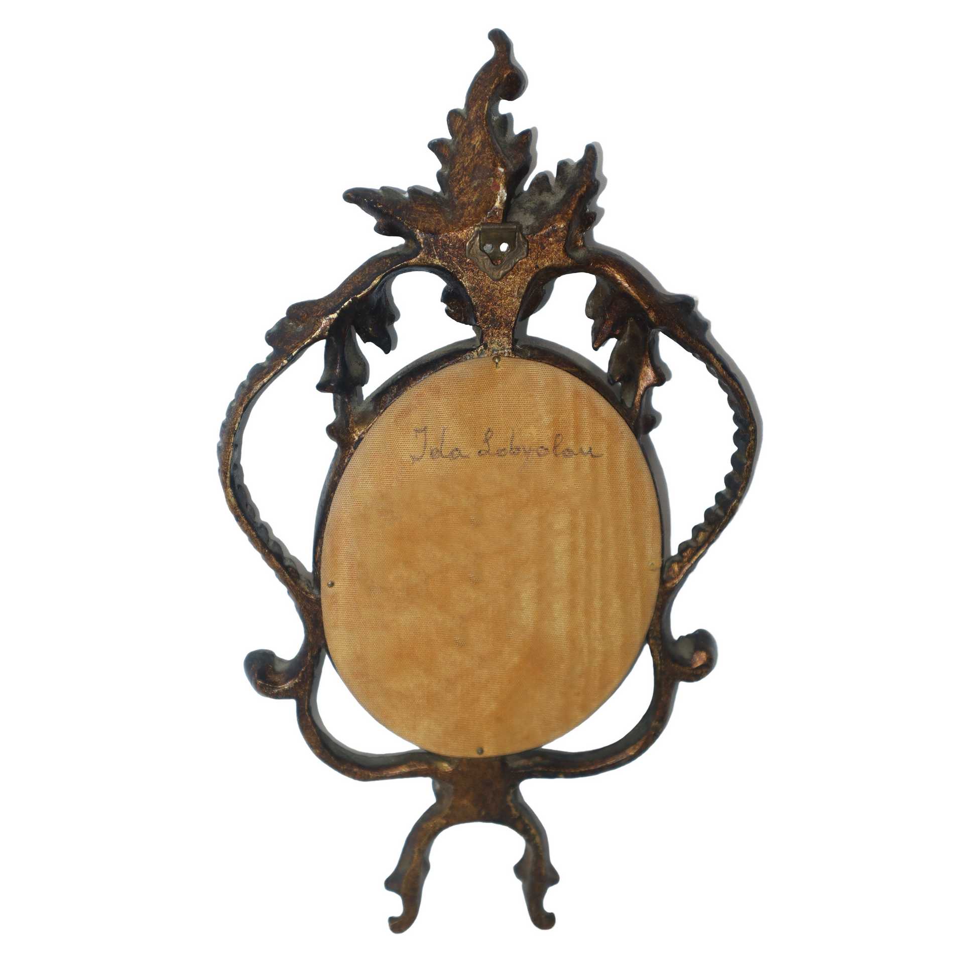 Miniatura raffigurante donna velata con copricapo quattrocentesco, entro cornice dorata., 20° secolo H cm 23x13 tempera Firmata al lato sinistro Ida Labyolan
