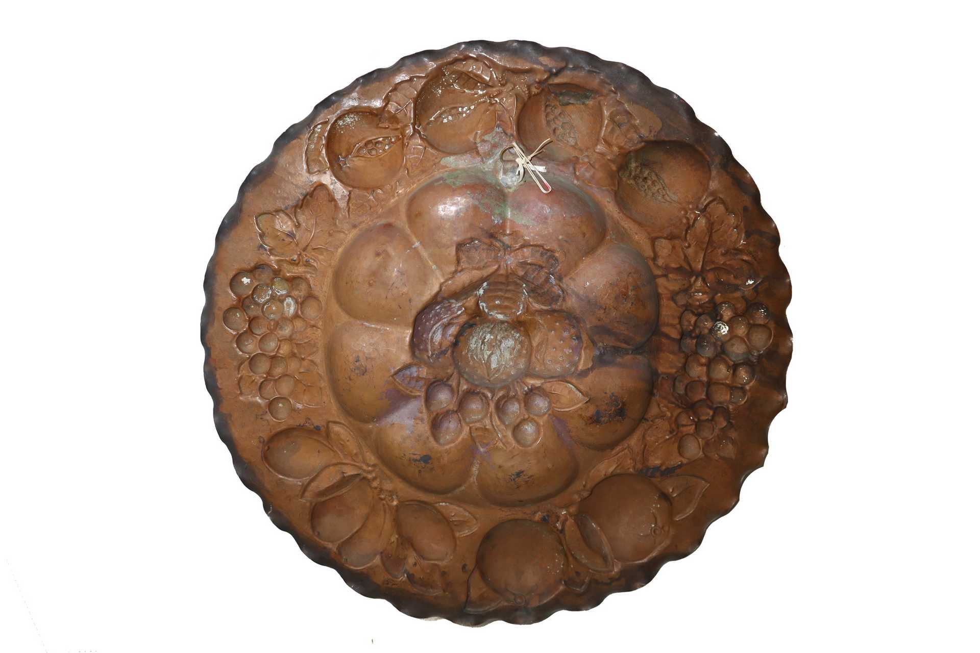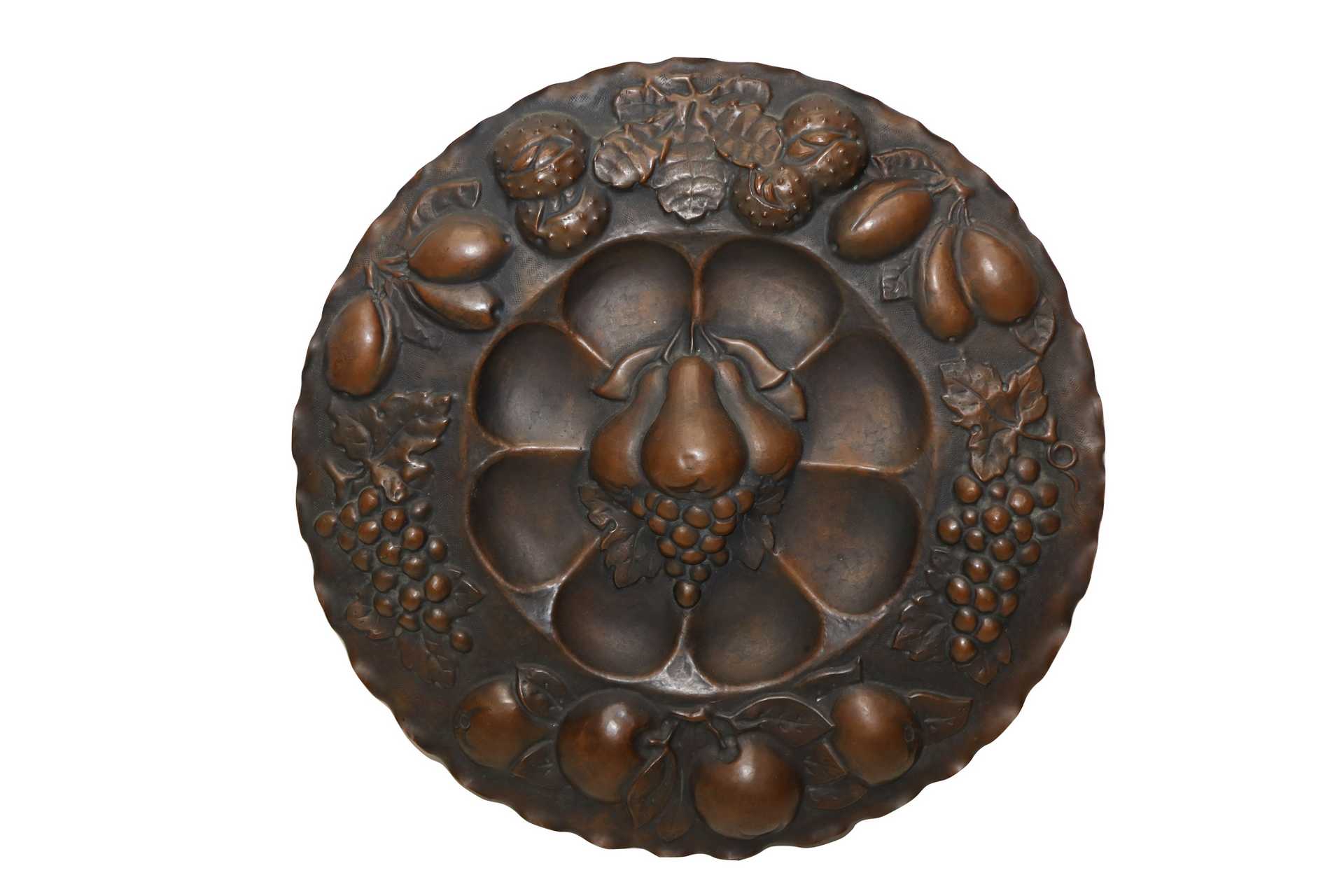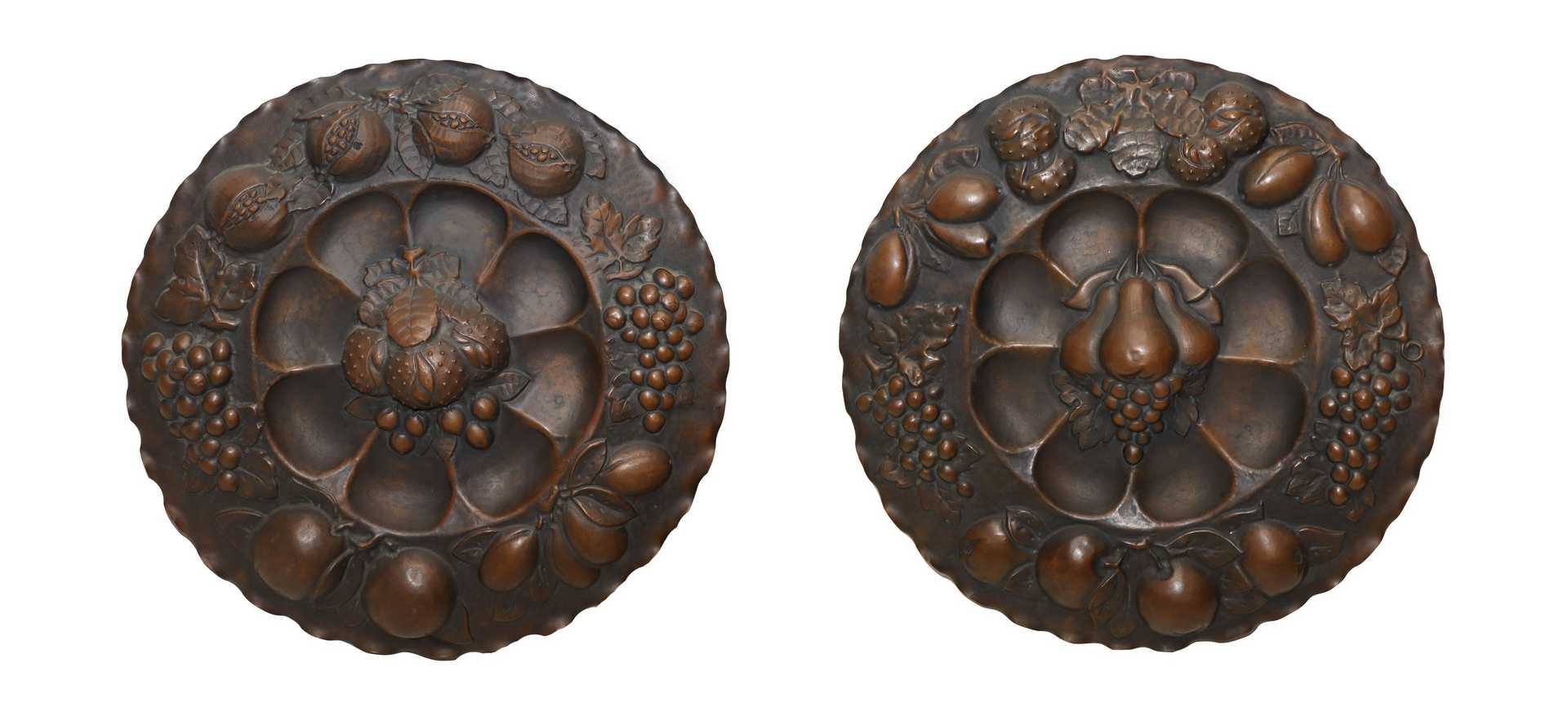 Coppia di piatti con lavorazione di frutti a sbalzo Diametro cm 47 in ottone patinato bruno