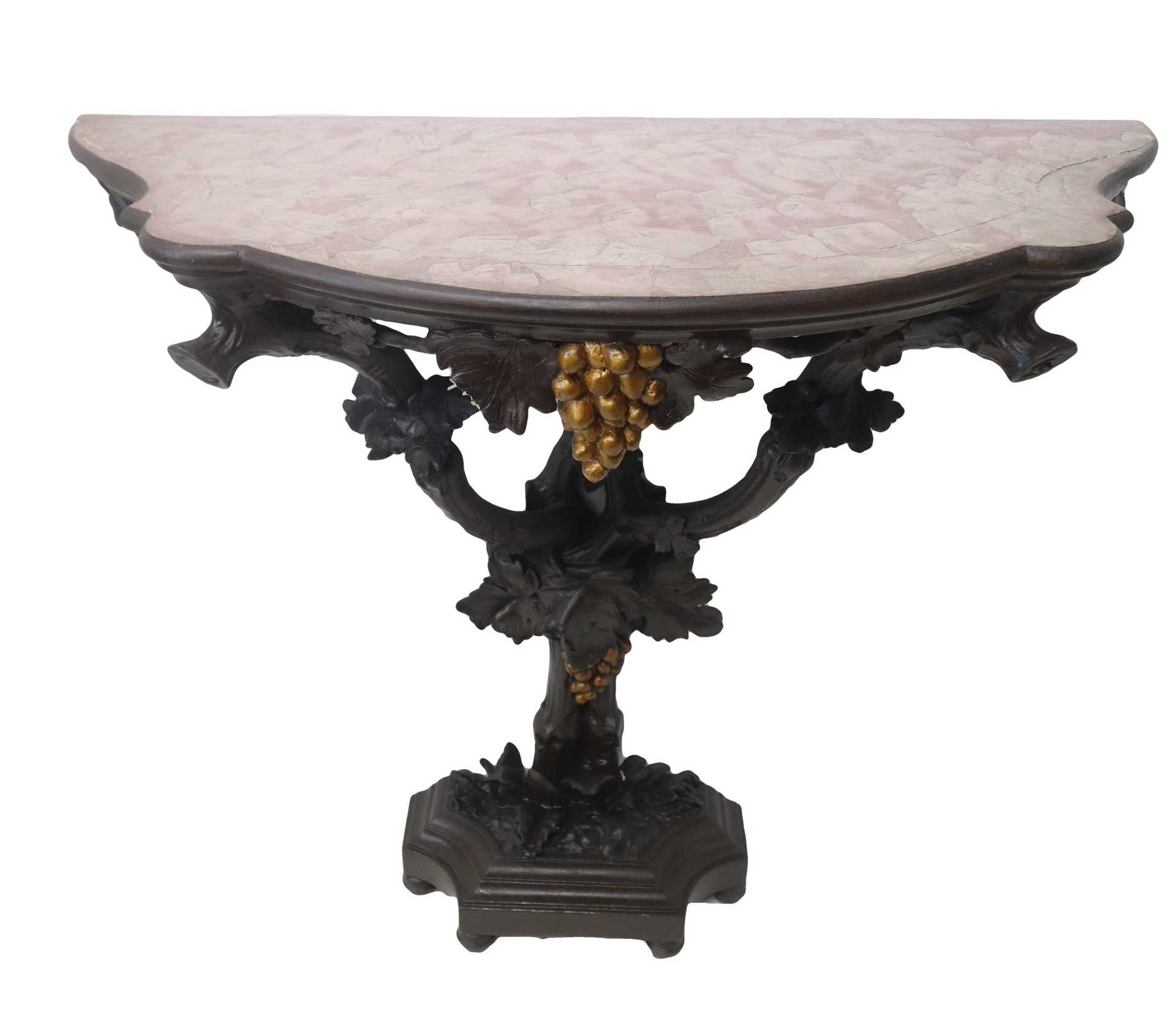 Console in legno intagliato a foglie di vite., Venice, late 19° secolo H cm 100 x L cm 107 x P cm 48 Parti dorate, piano laccato in finto marmo. Presenti rotture ed incollatureParti dorate, piano laccato in finto marmo. Presenti rotture ed incollature