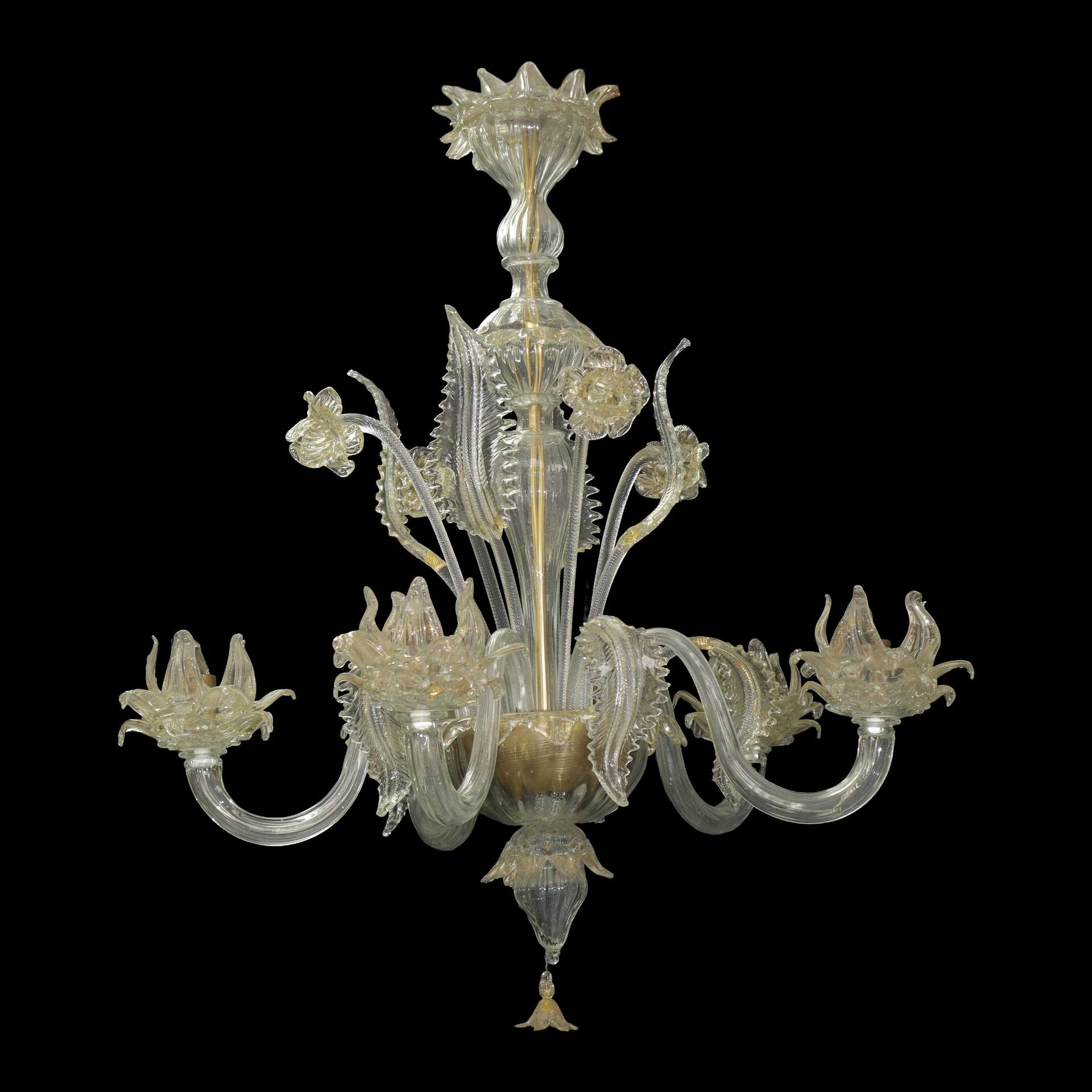 Lampadario a cinque luci in vetro di Murano trasparente con dettagli in oro H cm 96x75