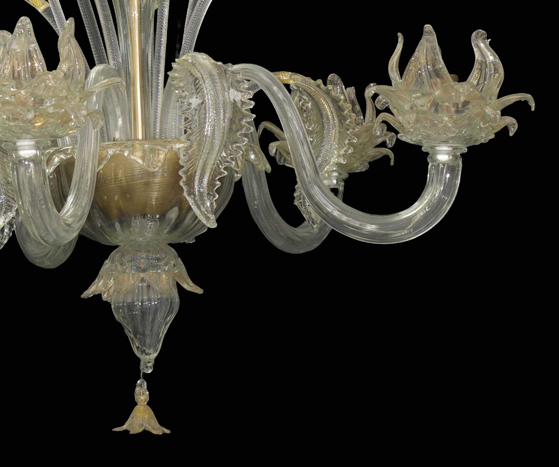 Lampadario a cinque luci in vetro di Murano trasparente con dettagli in oro