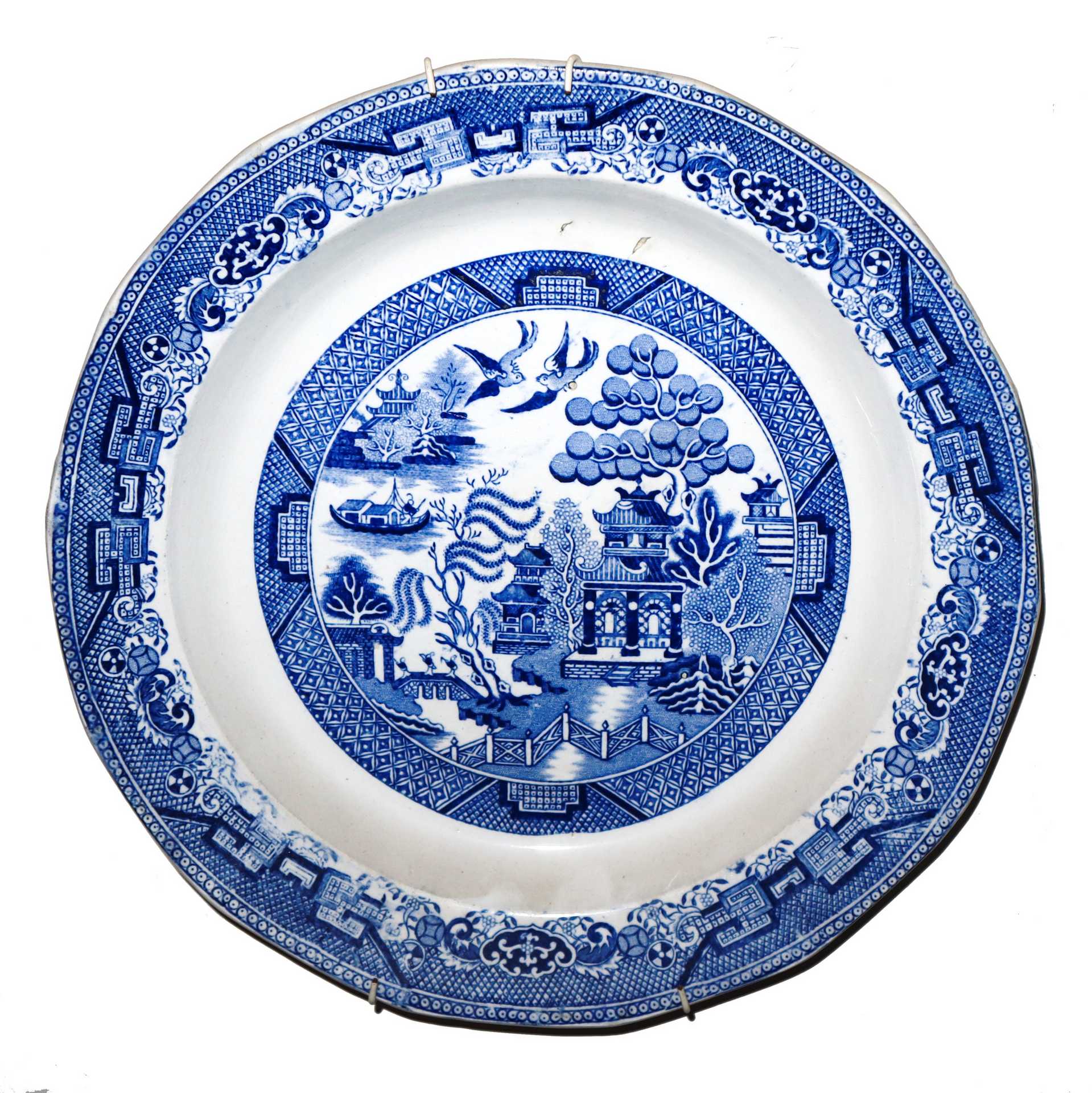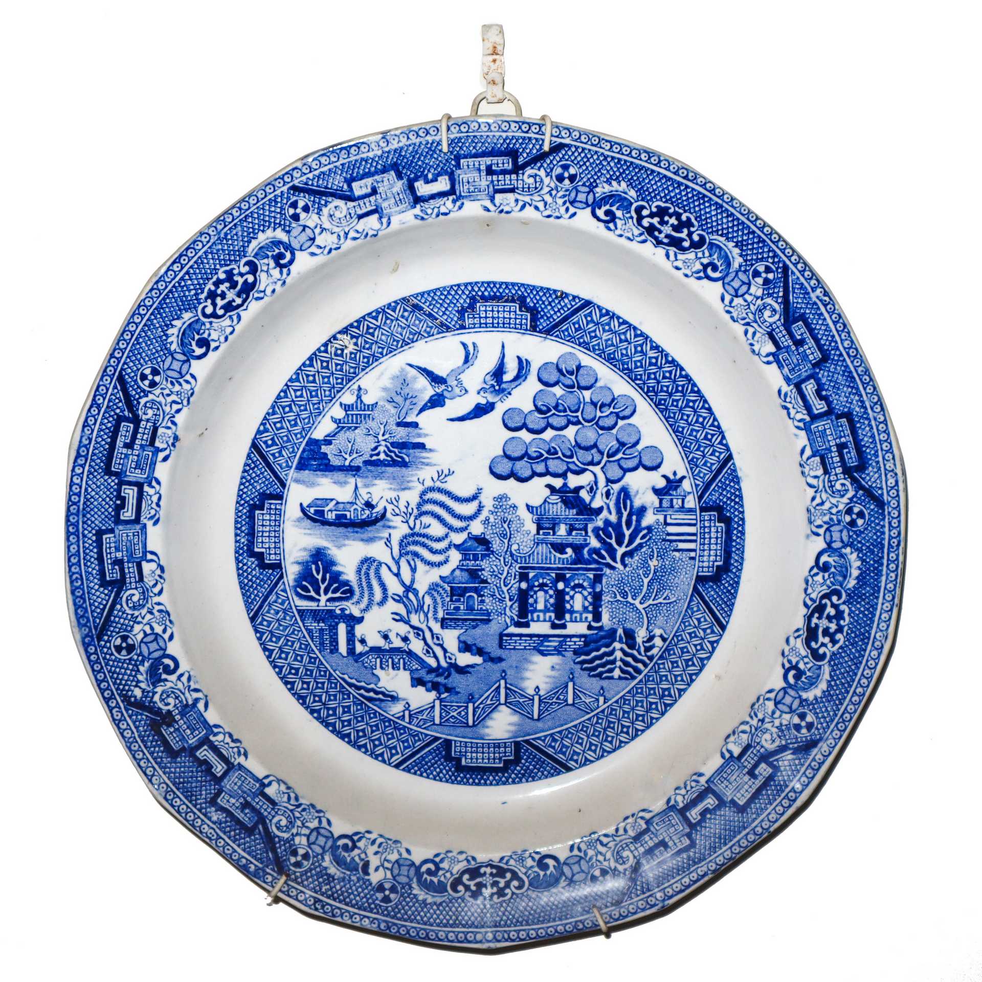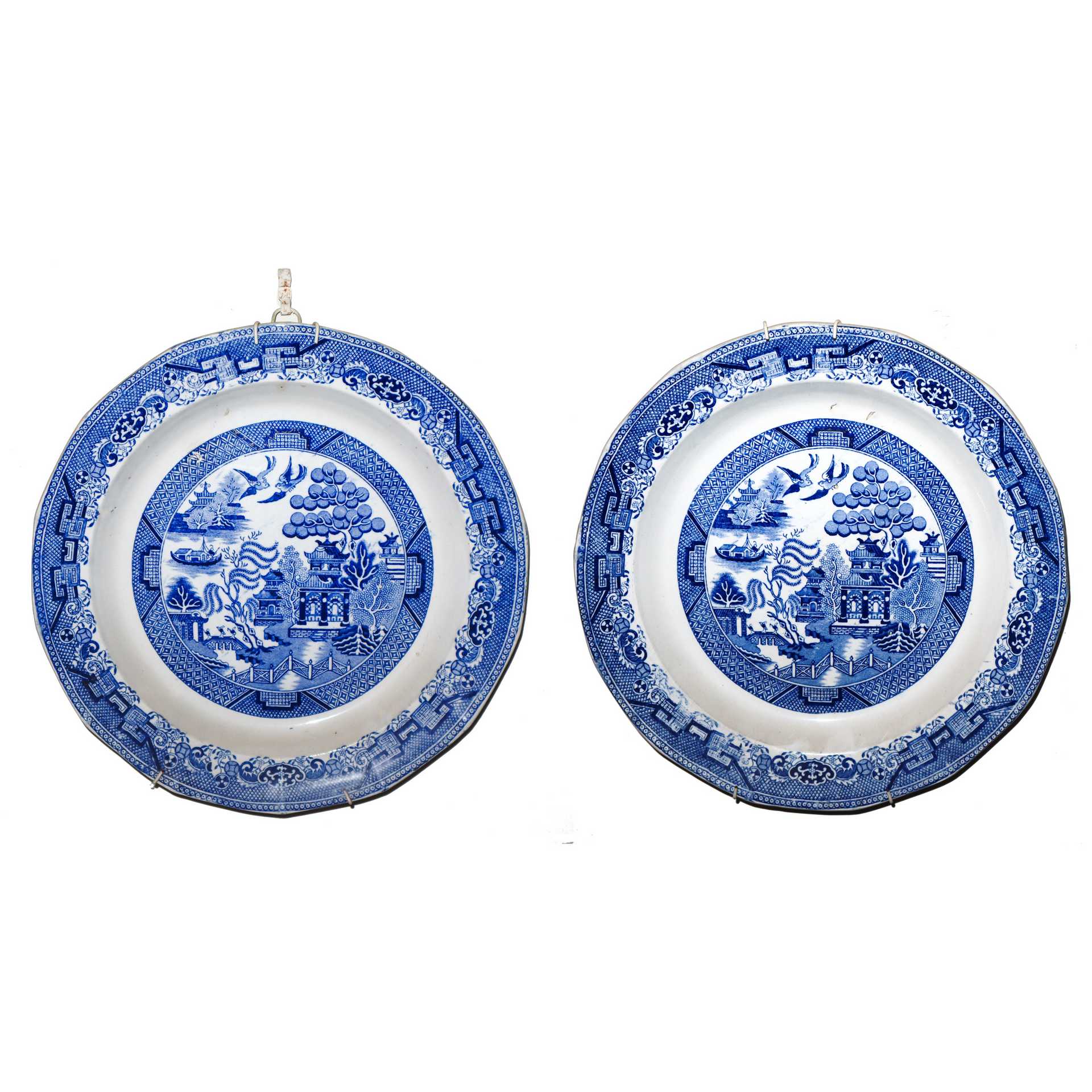 Coppia di antichi piatti rotondi Blue white Staffordshire Diametro cm 31 Con raffigurazioni di paesaggi e motivi geometriciCon raffigurazioni di paesaggi e motivi geometrici