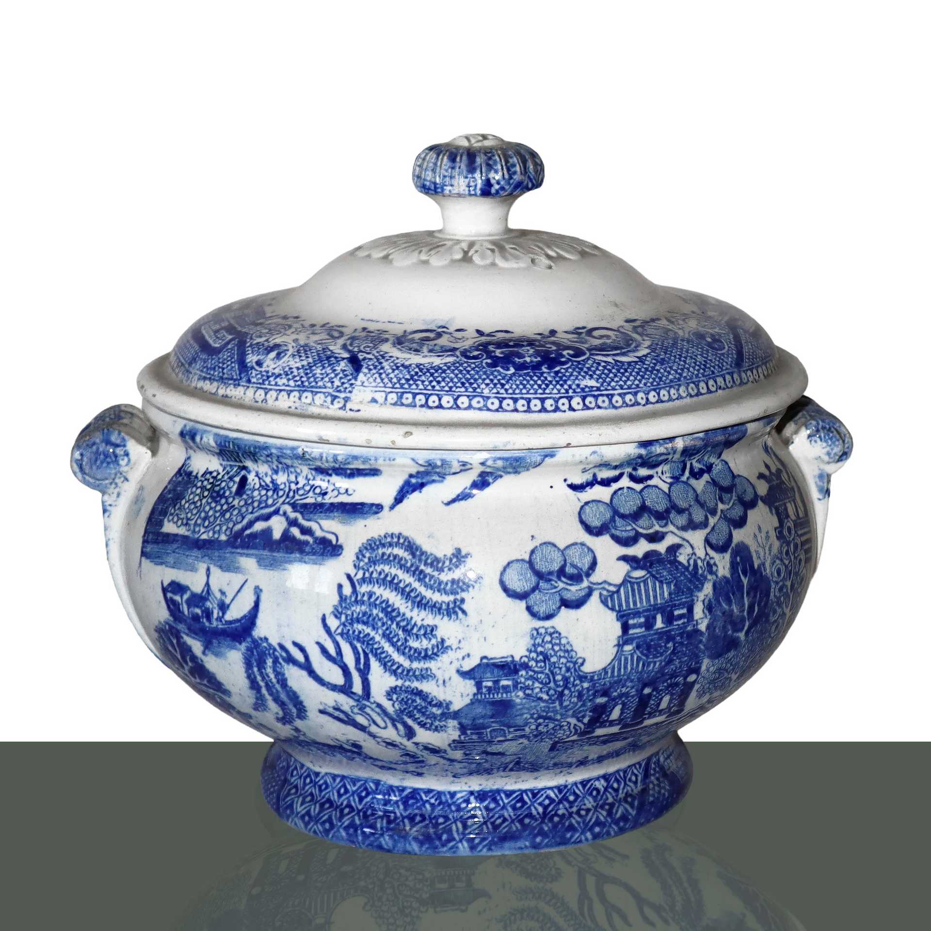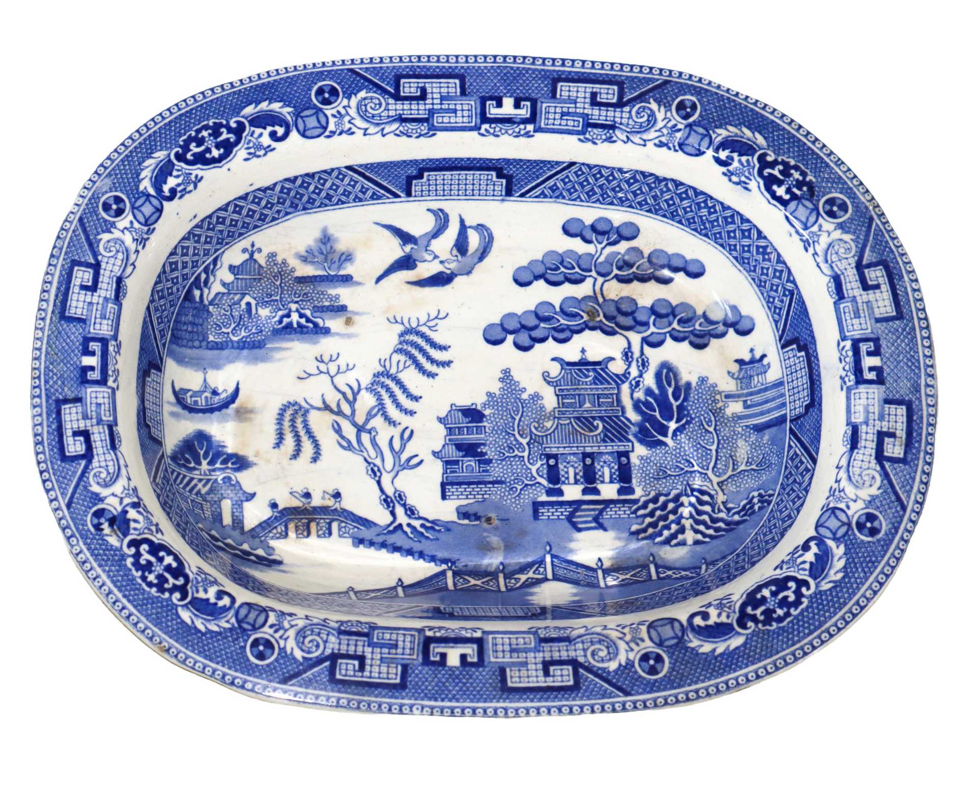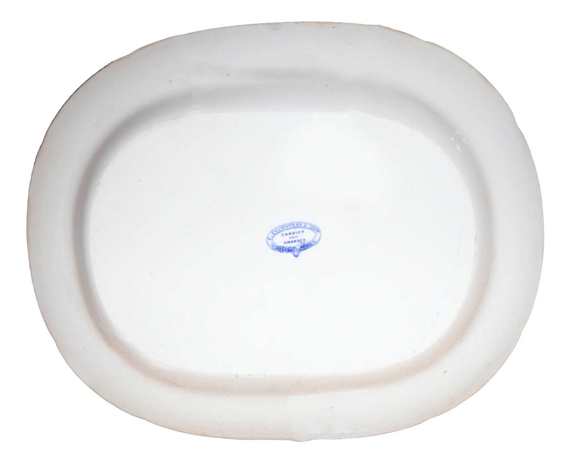 Due piatti fondi ovali e due potiches con disegni orientali Cm 31 x 24, putiche h cm 13 x 23