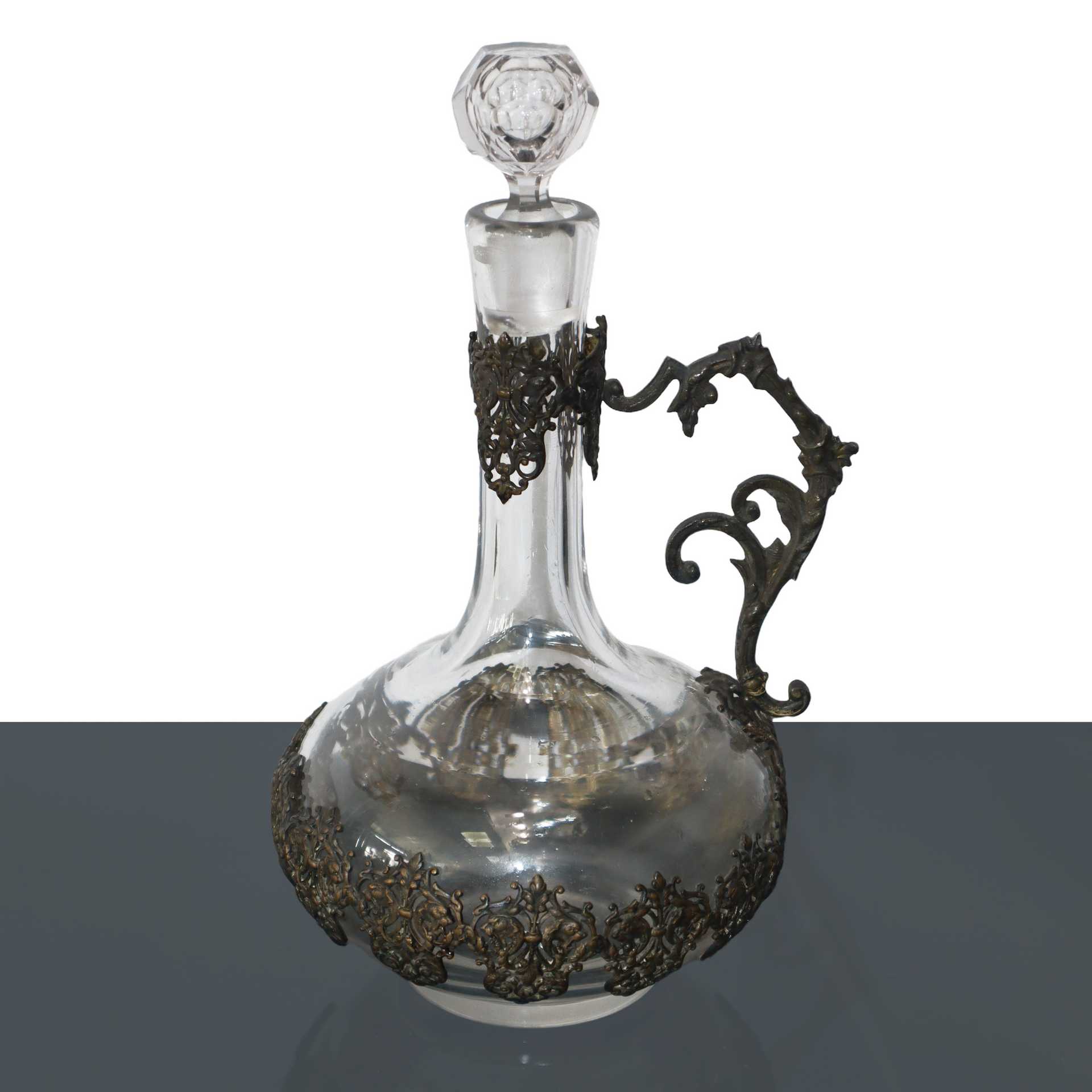 Lotto 158 | Piatto con bottiglie e bicchierini da liquore in vetro con decorazione in ottone