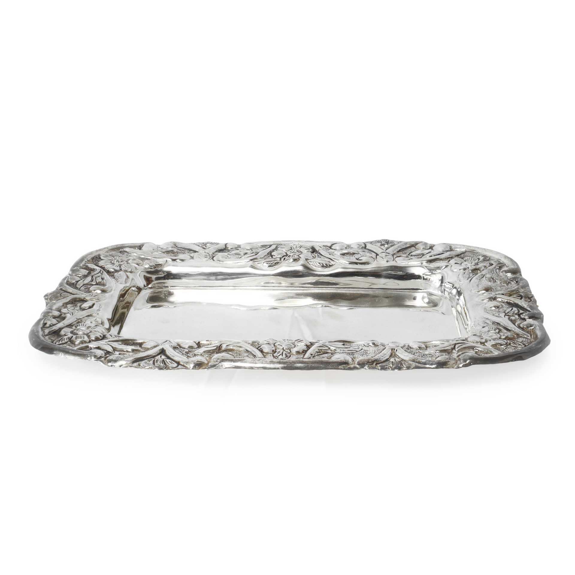 Sweet England - Vassoio da portata piccolo H cm 20 x 28 Vassoio piccolo da porta in argento; bordo con decorazini floreali; presenta sul retro il nome dell'autore Vassoio piccolo da porta in argento; bordo con decorazini floreali; presenta sul retro il nome dell'autore