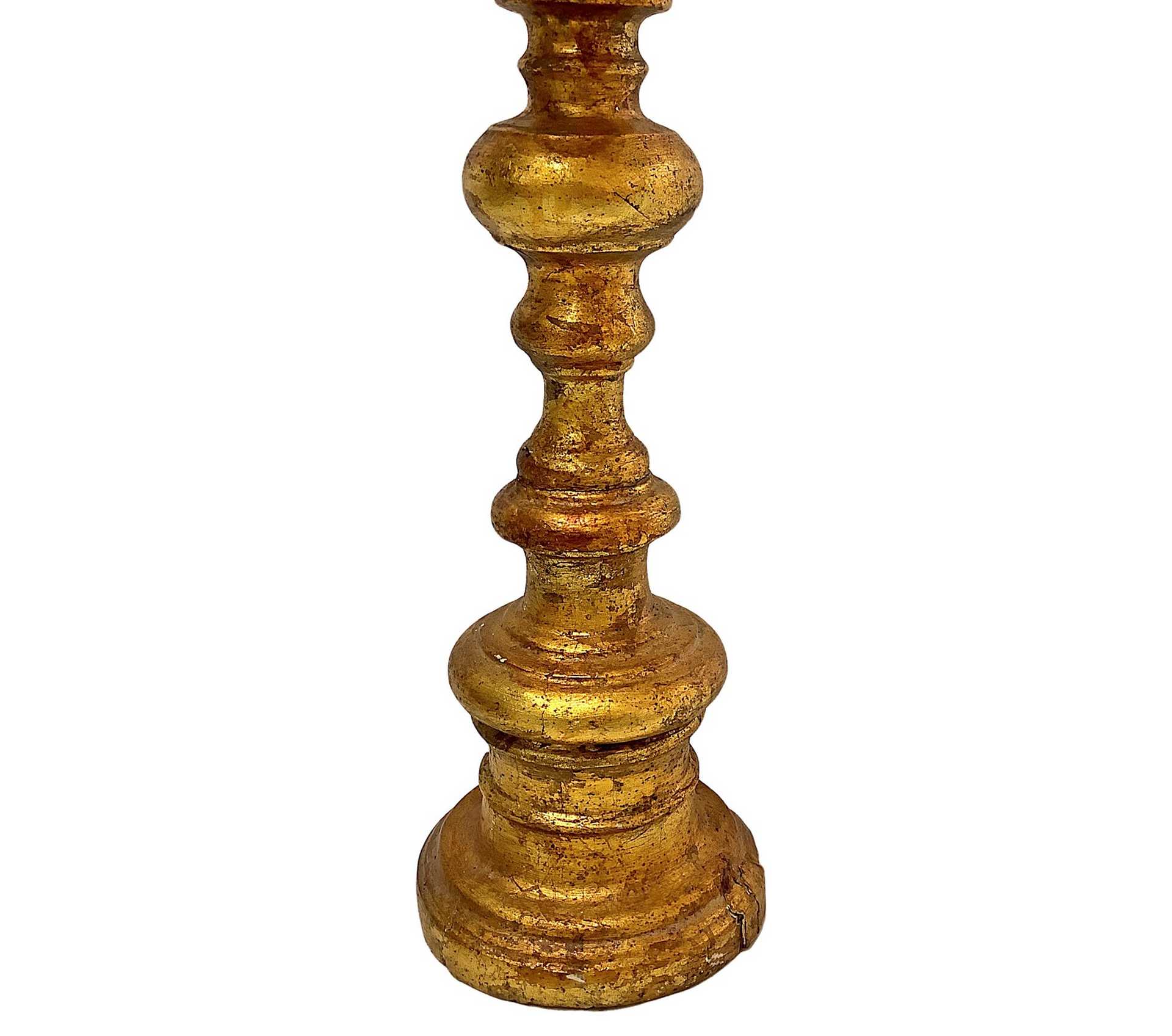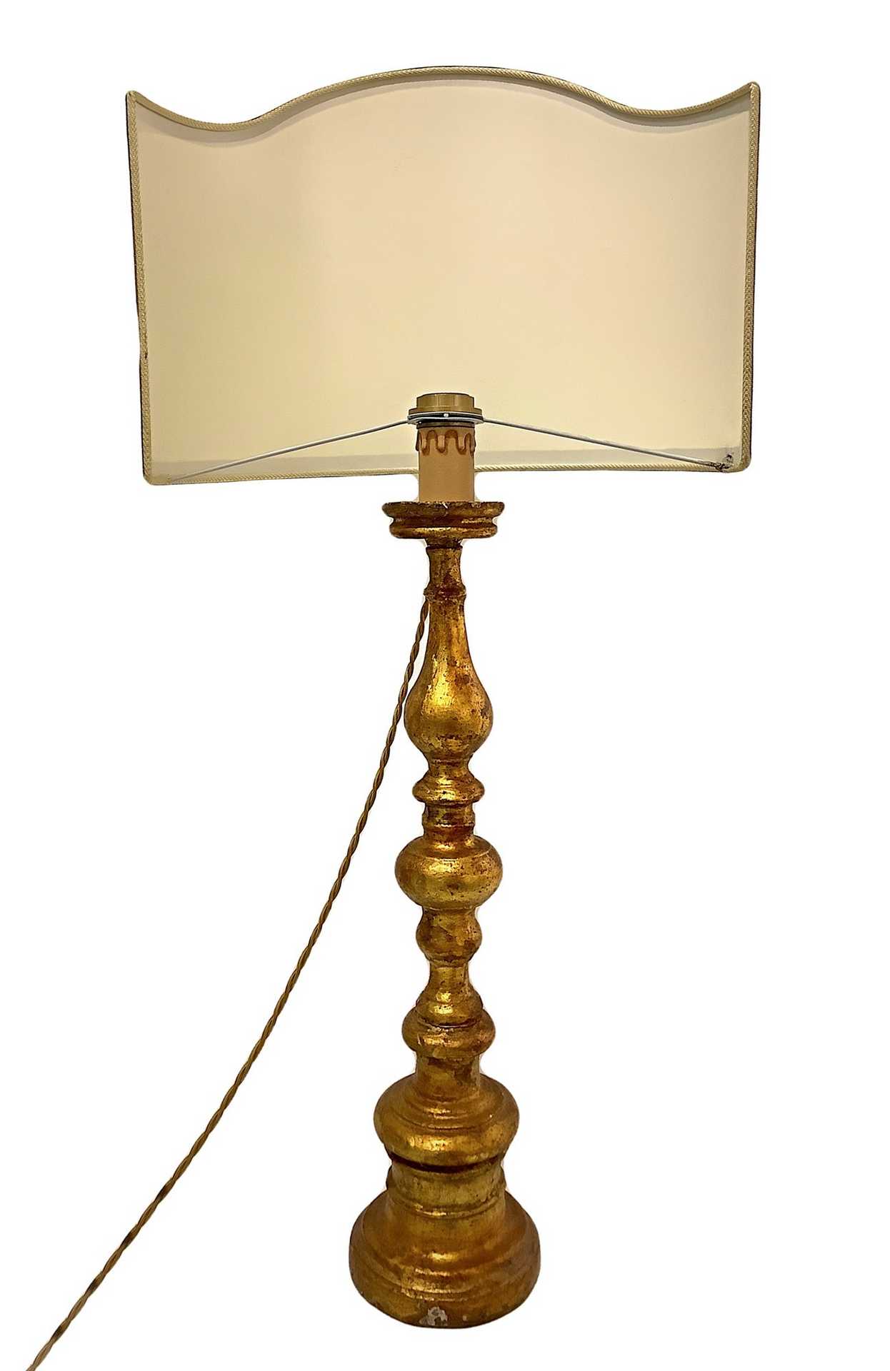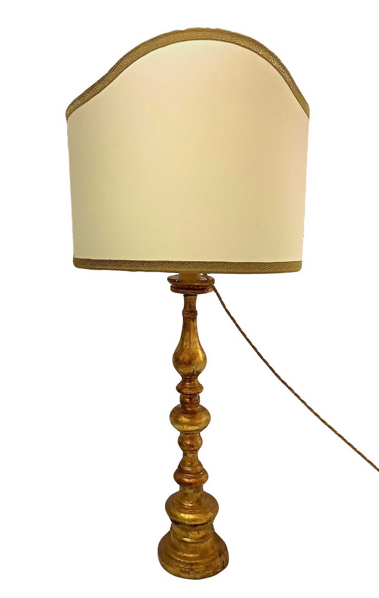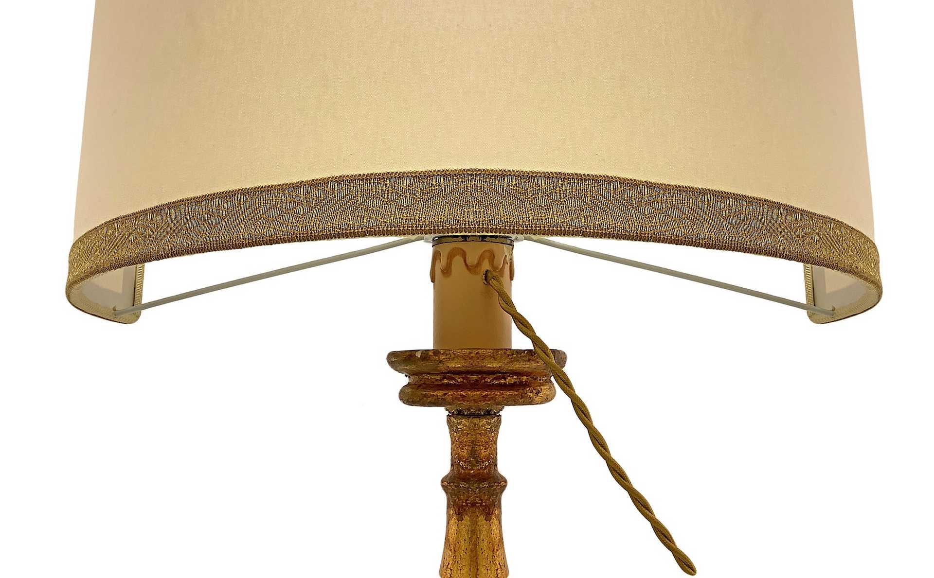Lume in legno dorato con ventola in stoffa, Early 20° secolo h 100 cm, larghezza ventola 47 cm