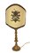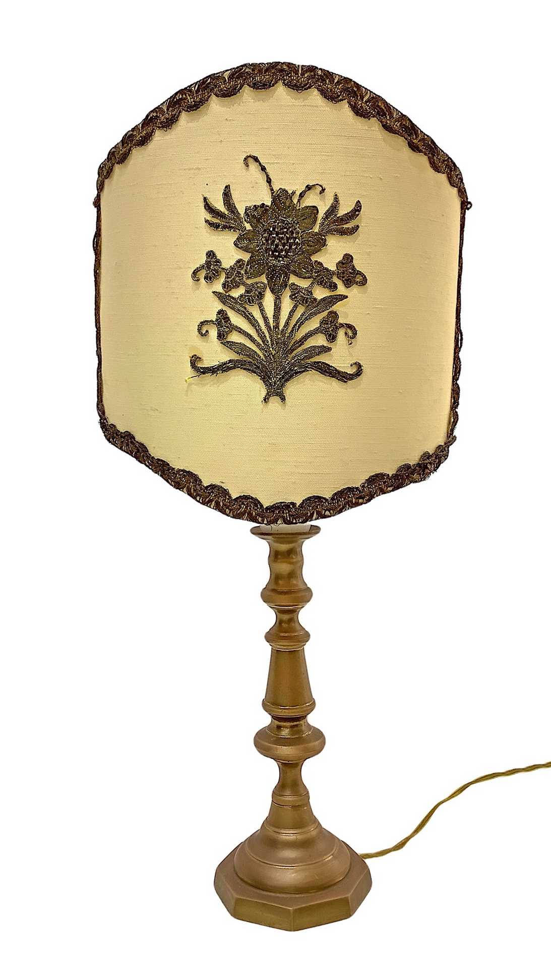 Coppia di lumetti in metallo con ventola in stoffa ricamata, Early 20° secolo h 50 cm