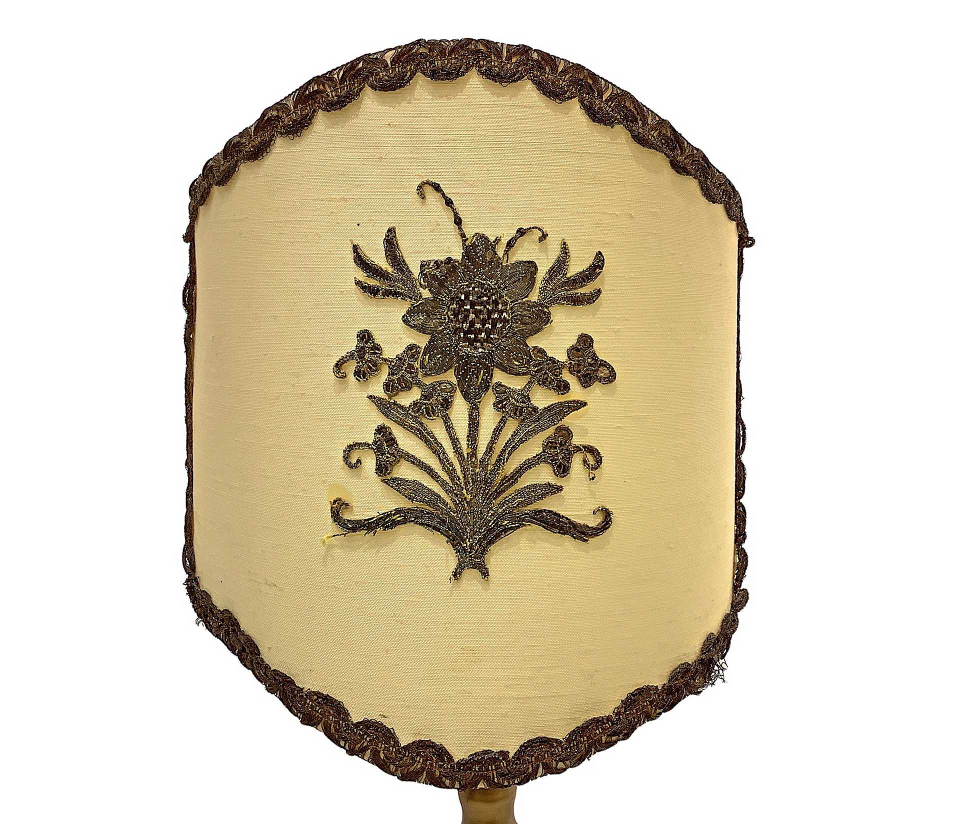 Coppia di lumetti in metallo con ventola in stoffa ricamata, Early 20° secolo