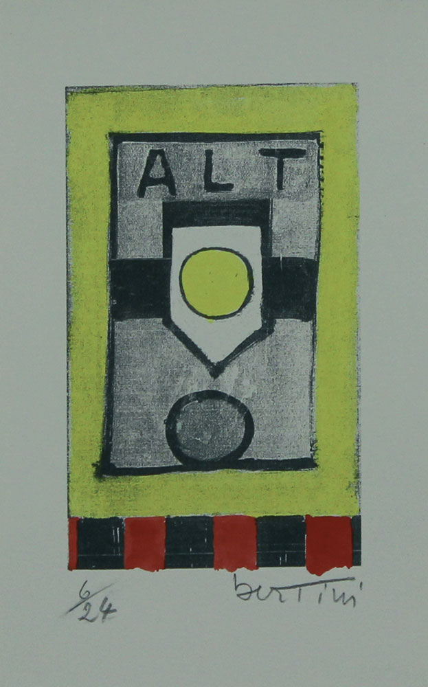 Bertini Gianni Senza titolo olografia acquerellata su carta, cm. 28x18, es. 6/24 firmata in basso a destra, "Opera tratta da una tempera del 1949" e sigla al retro