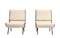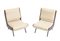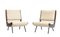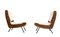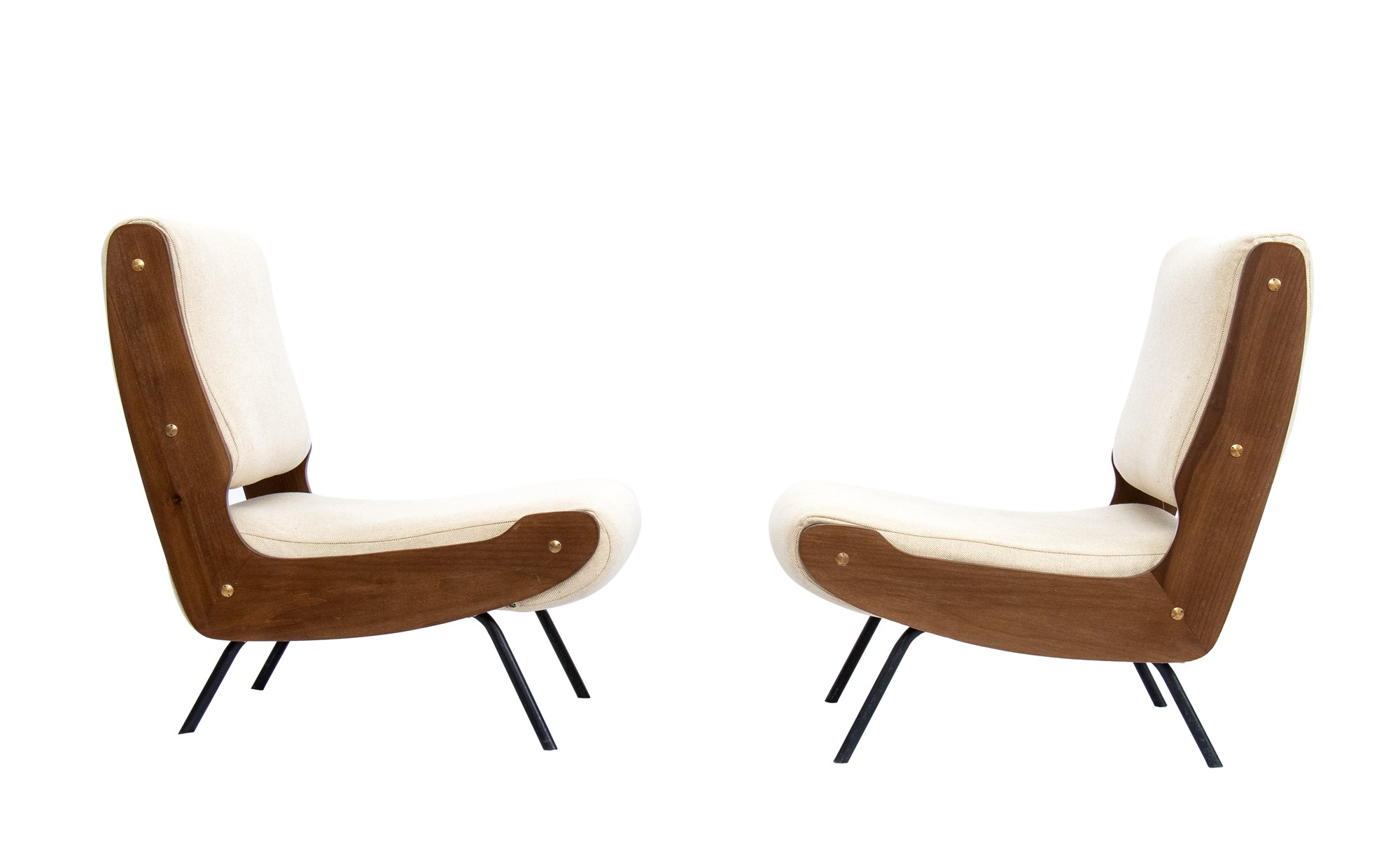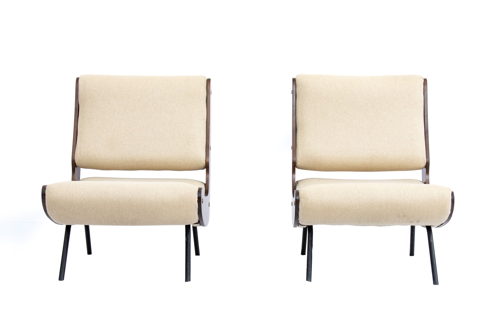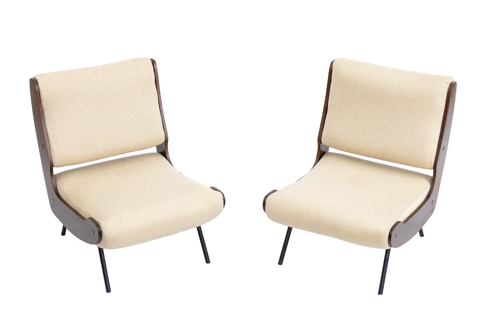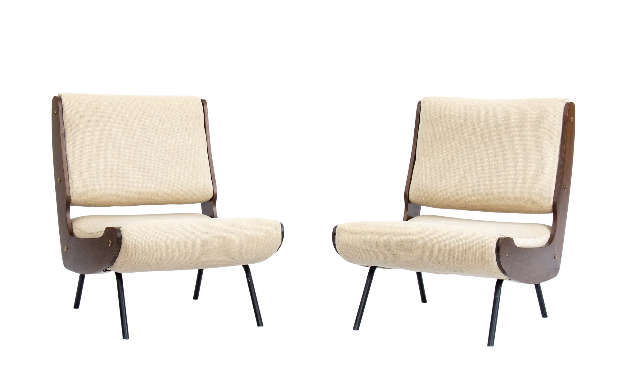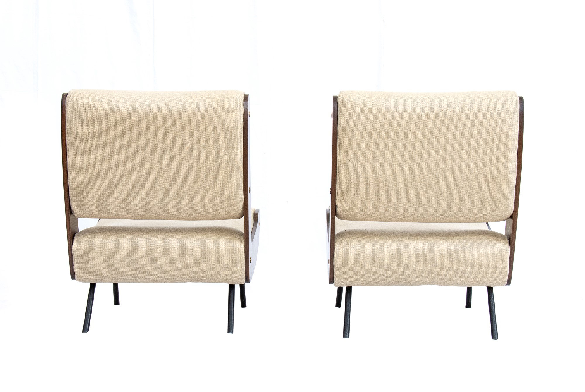 Coppia di poltrone mod 863 con struttura in legno e metallo e particolari in ottone. Sostegni in metallo laccato. Gianfranco Frattini