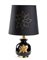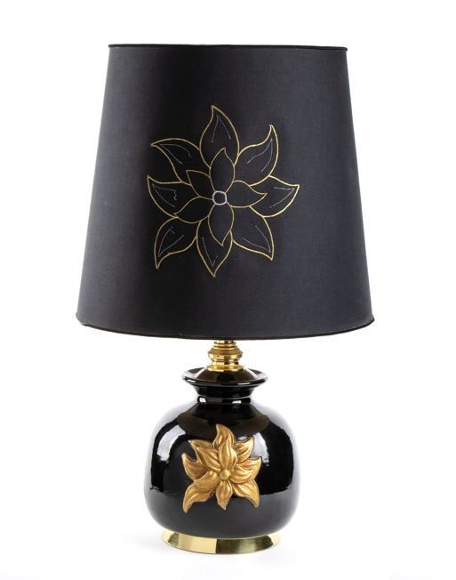 Lampada da tavolo in ceramica Cenacchi, Molinella. Corpo in ceramica nera con fiore oro a ornamento principale decorato a mano. Paravento originale con marchio e fiore dorato. Struttura in metallo dorato