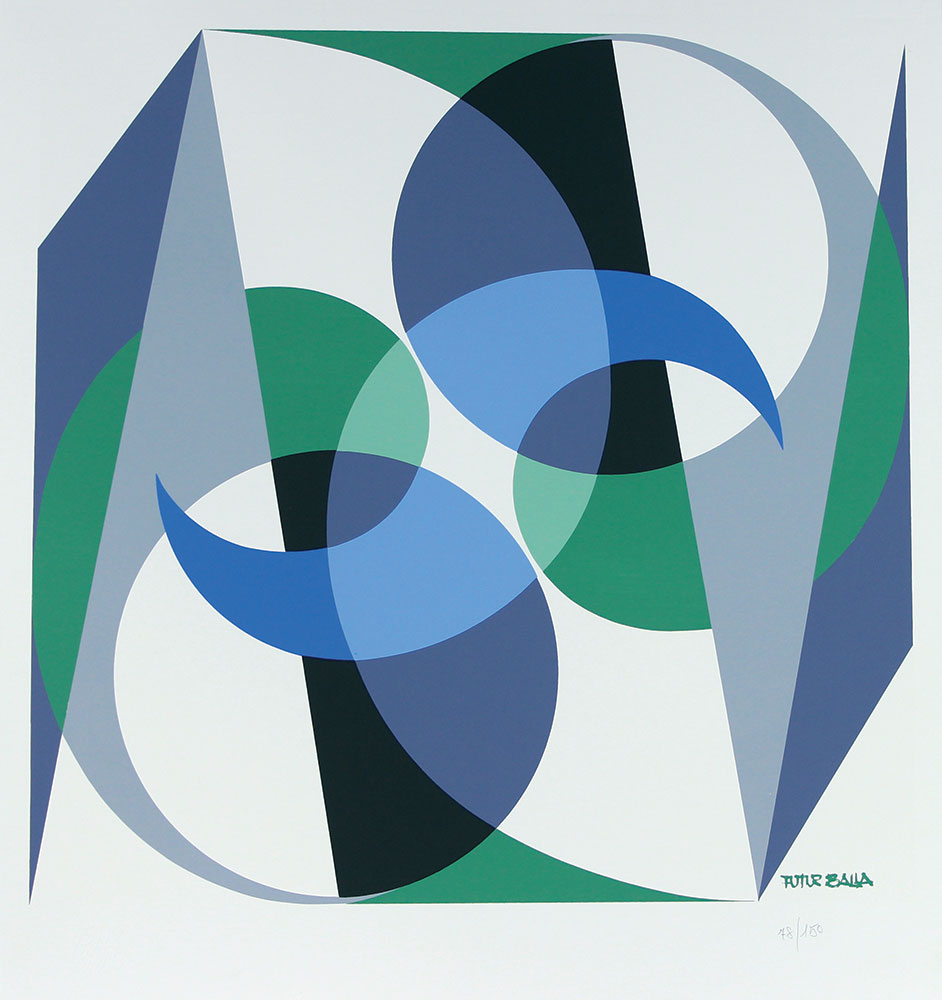 Balla Giacomo Equilibrio spaziale serigrafia su carta Fabriano, cm. 74x70, es. 78/150 timbro a secco Balla Futurista in basso a sinistra e Serigrafia dall'Originale Futurballa in basso a destra, firmata Futurballa in lastra, dichiarazione di garanzia di Luce Balla